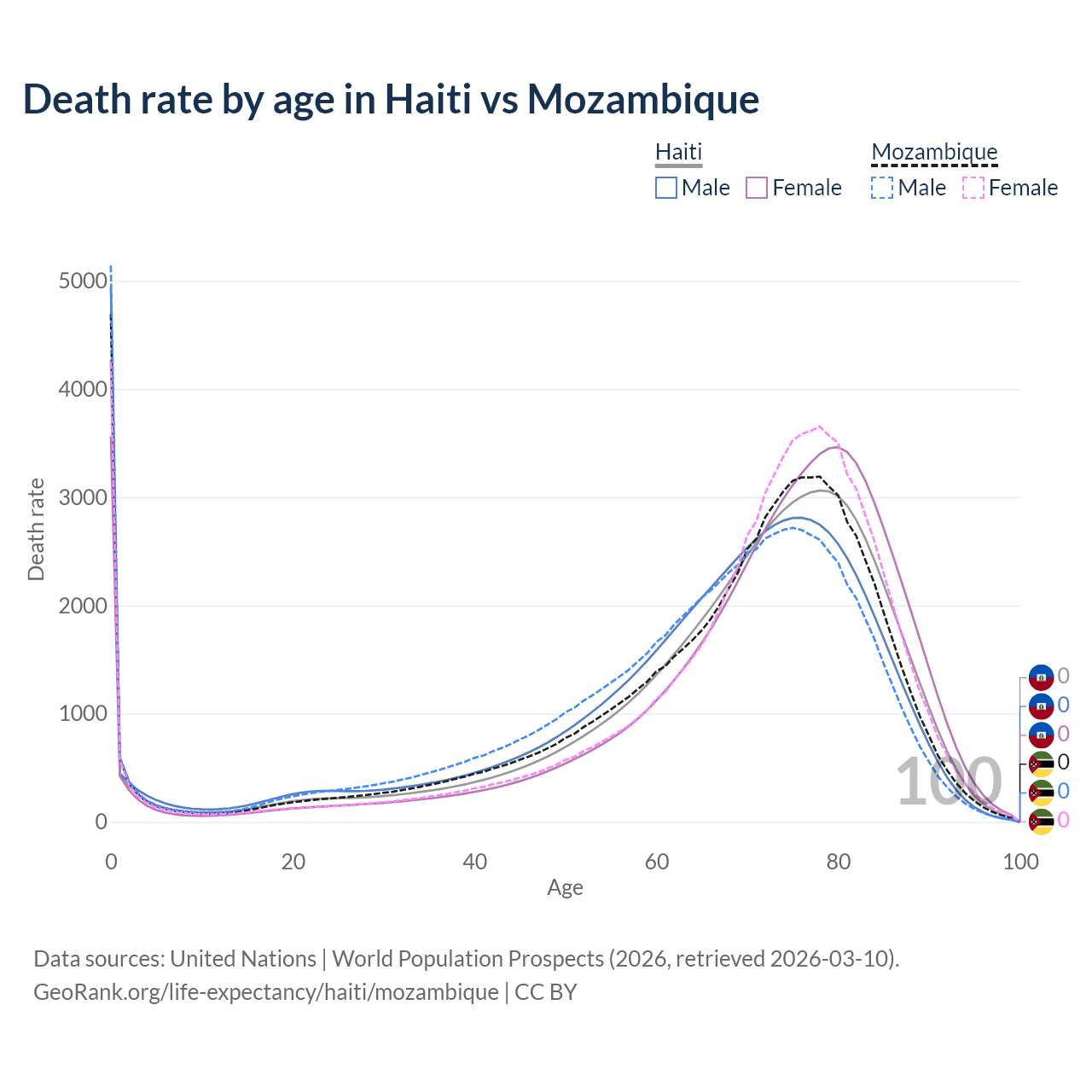 In Haiti, the most common age of death is 0, compared to 0 in Mozambique. The median age of death is 72 in Haiti and 71.2 in Mozambique, meaning only half of each cohort is expected to live past that age.