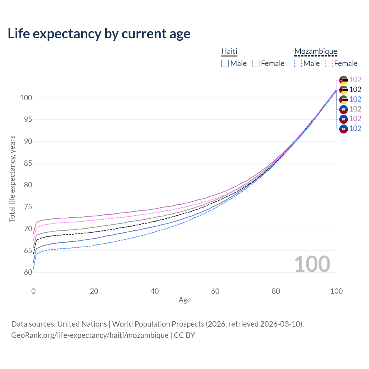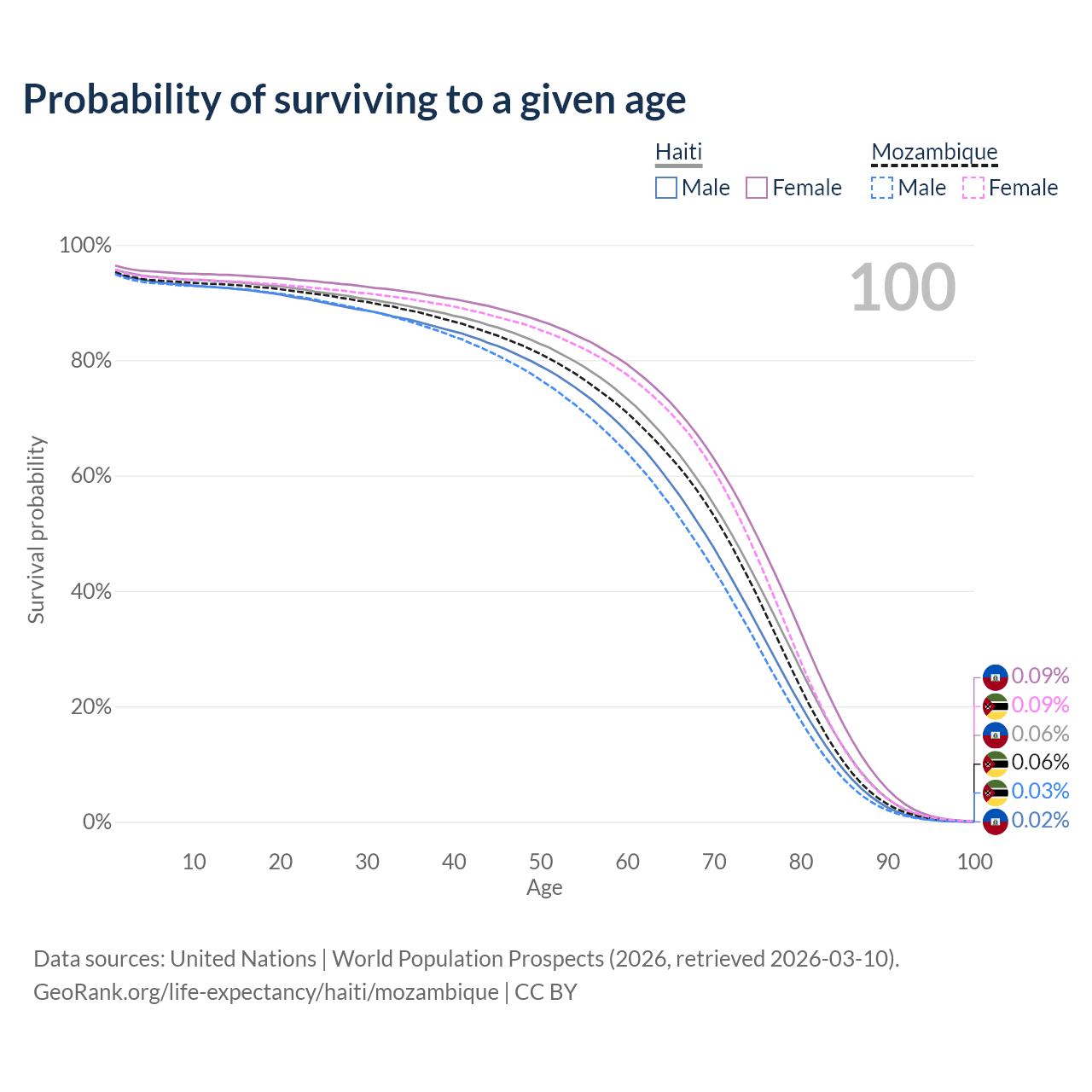 This life expectancy calculator shows the odds of living to 100, 95, 90, and below based on current age for both males and females in Haiti and Mozambique, along with mean and median age of death. The calculations are based on the 2026 life tables (actuarial tables) from the UN World Population Prospects.