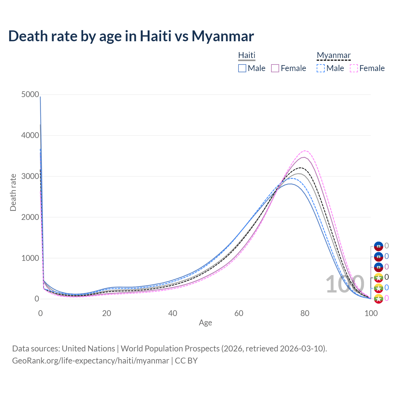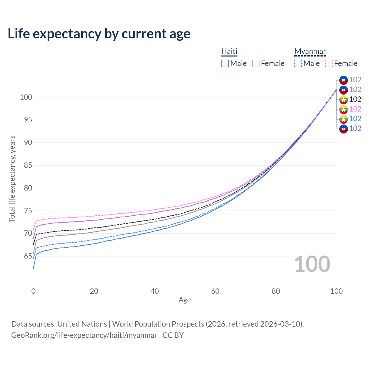 This life expectancy calculator shows the odds of living to 100, 95, 90, and below based on current age for both males and females in Haiti and Myanmar, along with mean and median age of death. The calculations are based on the 2026 life tables (actuarial tables) from the UN World Population Prospects.