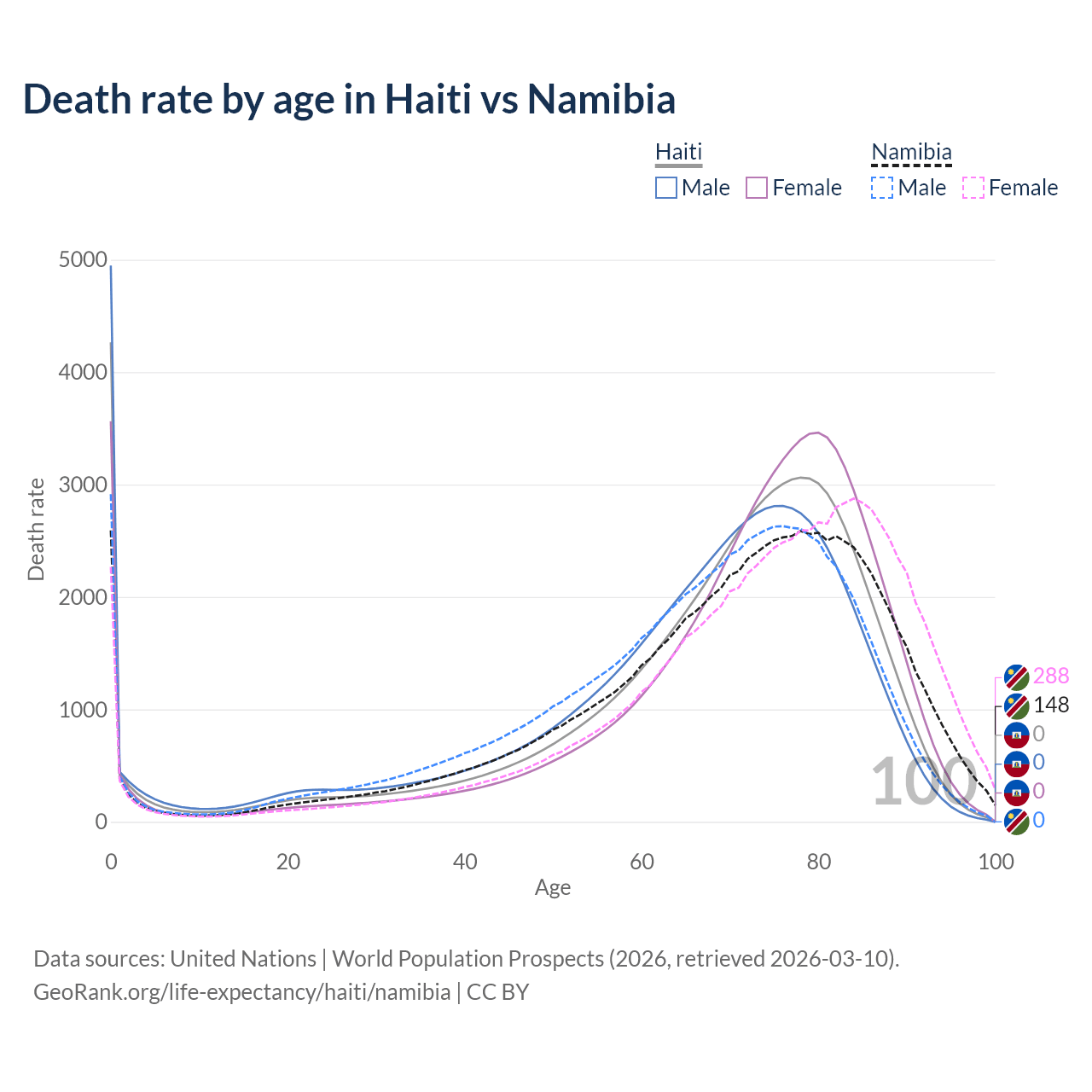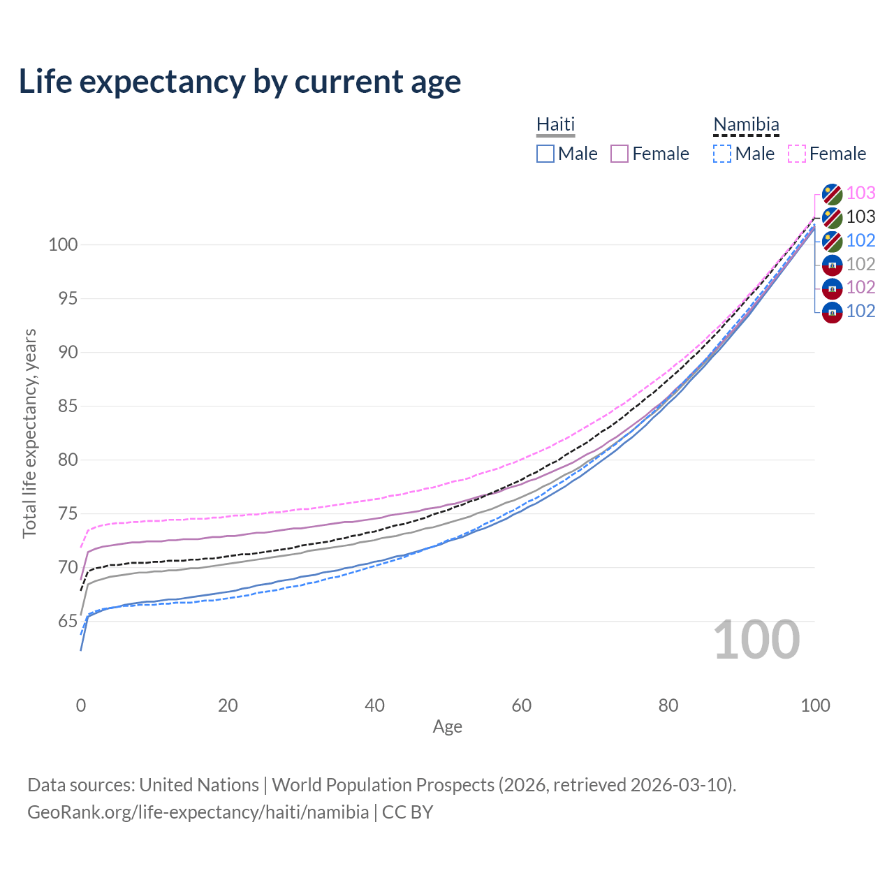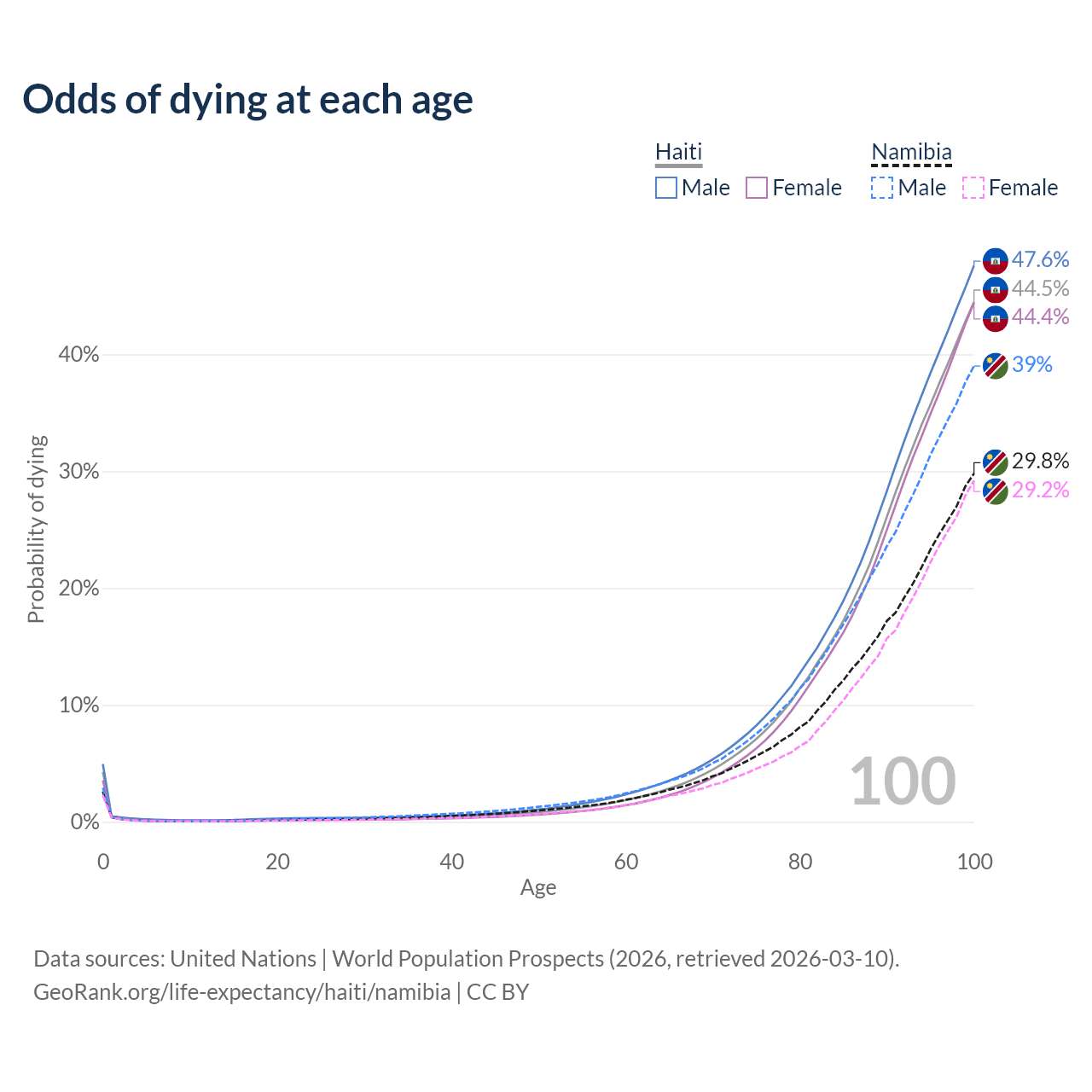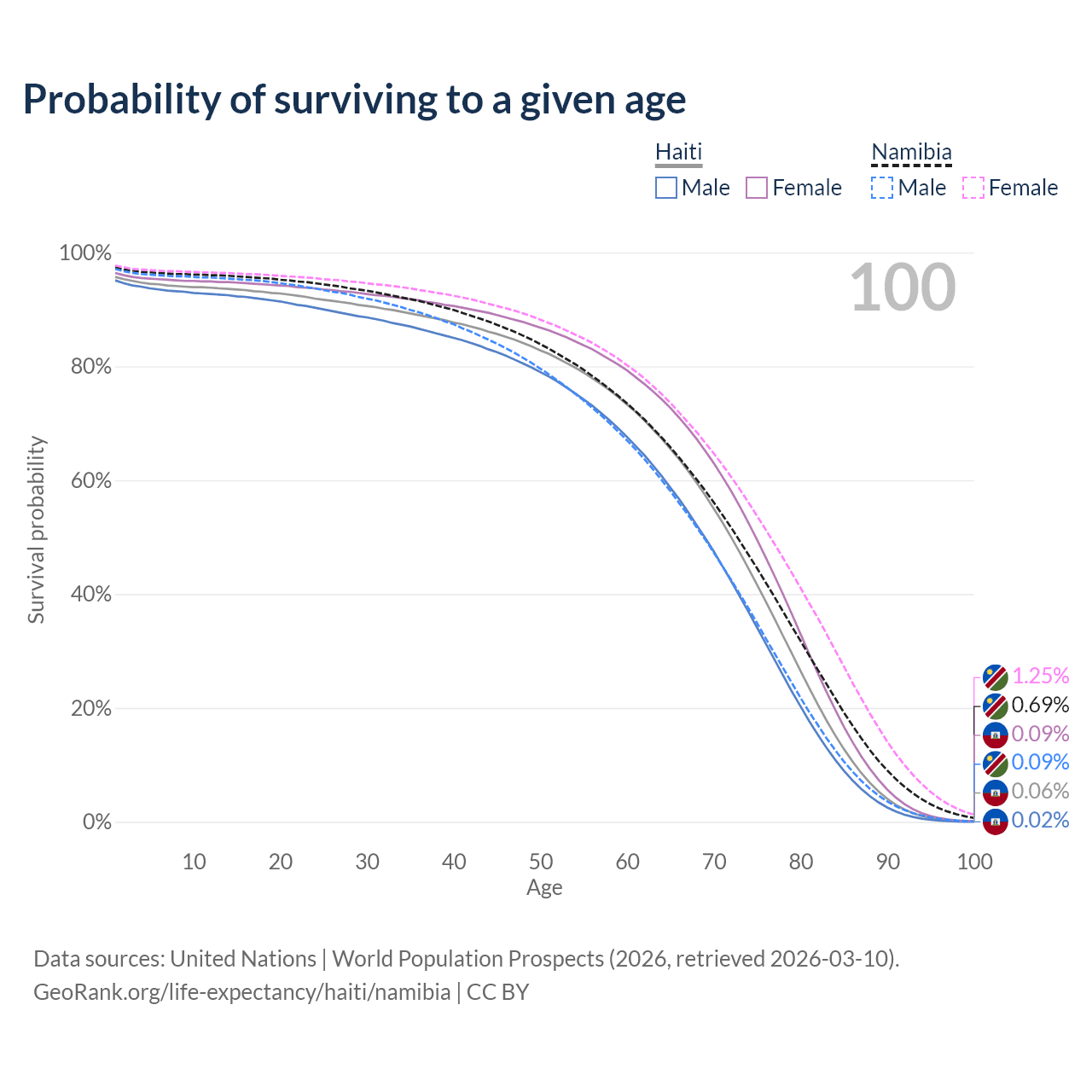 This life expectancy calculator shows the odds of living to 100, 95, 90, and below based on current age for both males and females in Haiti and Namibia, along with mean and median age of death. The calculations are based on the 2026 life tables (actuarial tables) from the UN World Population Prospects.