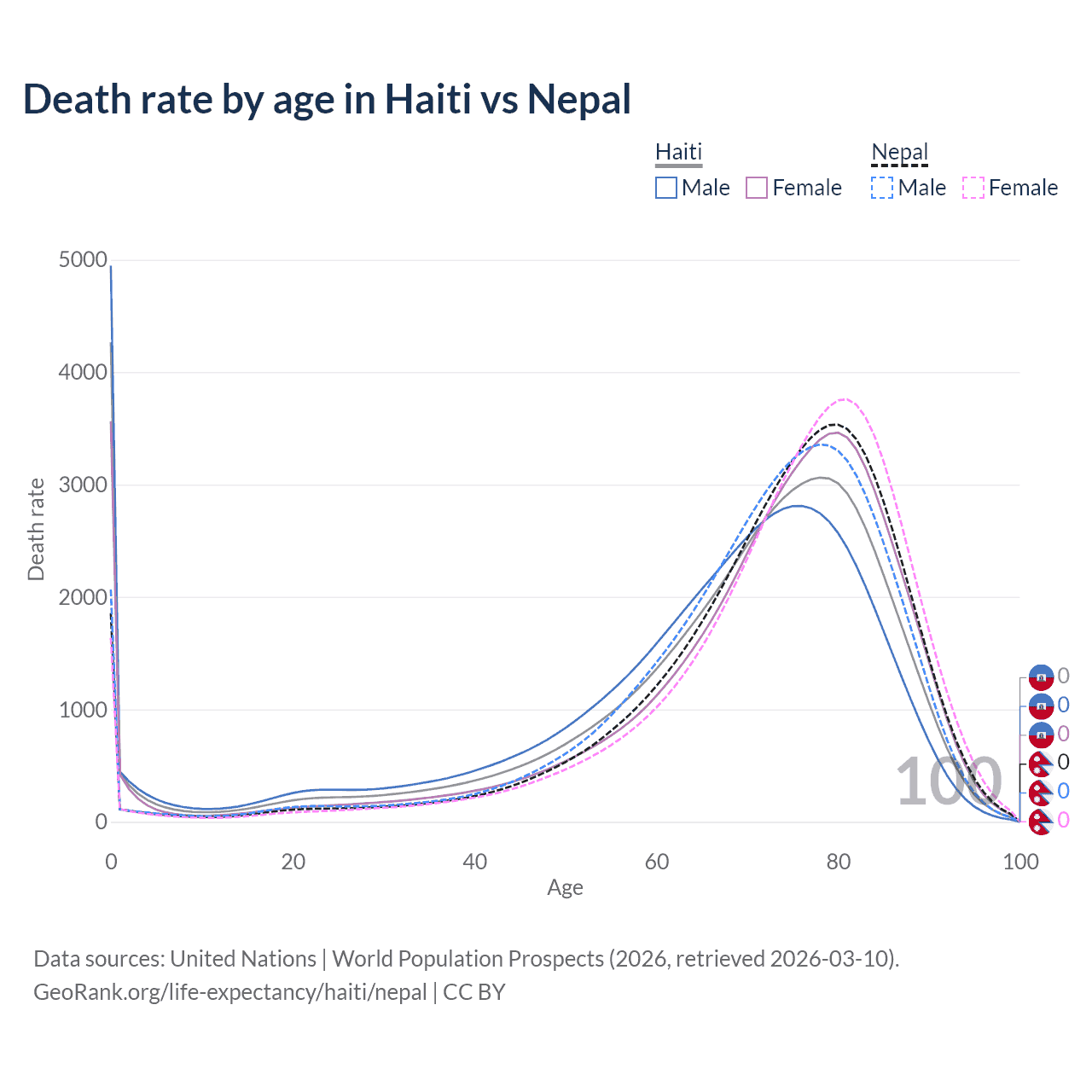 In Haiti, the most common age of death is 0, compared to 80 in Nepal. The median age of death is 72 in Haiti and 75.4 in Nepal, meaning only half of each cohort is expected to live past that age.