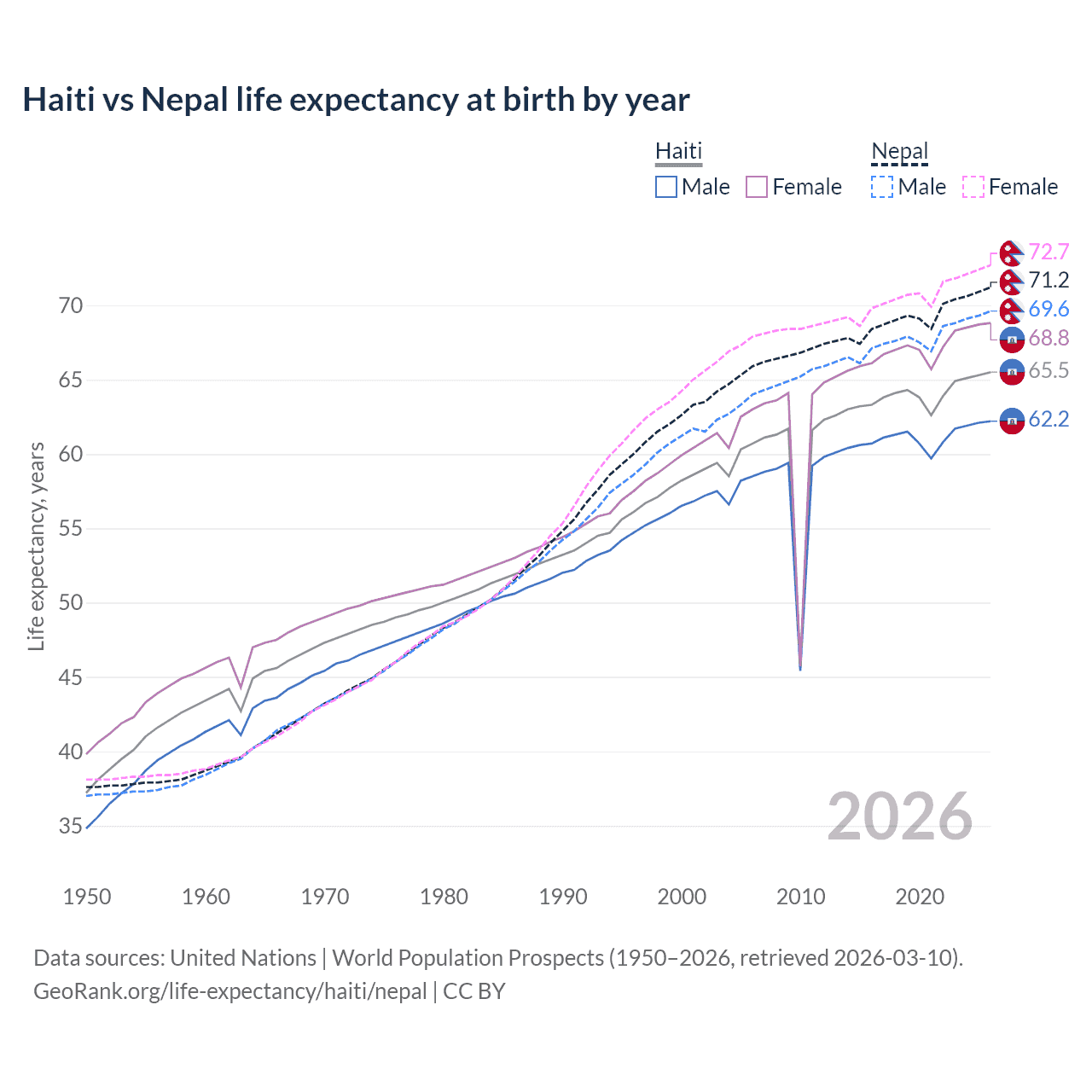 The average life expectancy at birth is 65.5 years in Haiti vs 71.2 in Nepal. Haiti is ranked 170/197 by life expectancy, and Nepal is 131/197. In Haiti, the life expectancy is 62.2 years for males and 68.8 years for females. In Nepal, it's 69.6 years for males and 72.7 years for females.