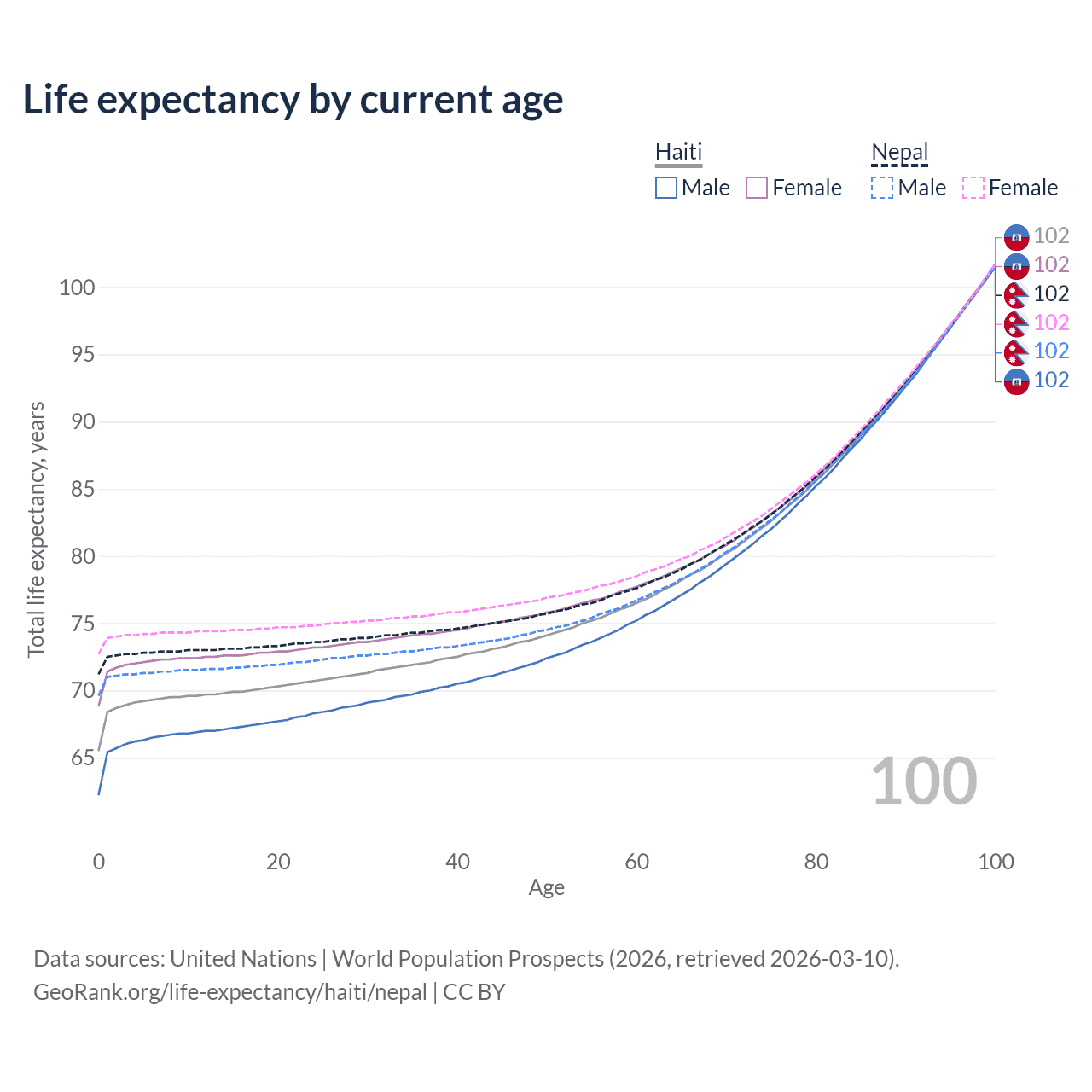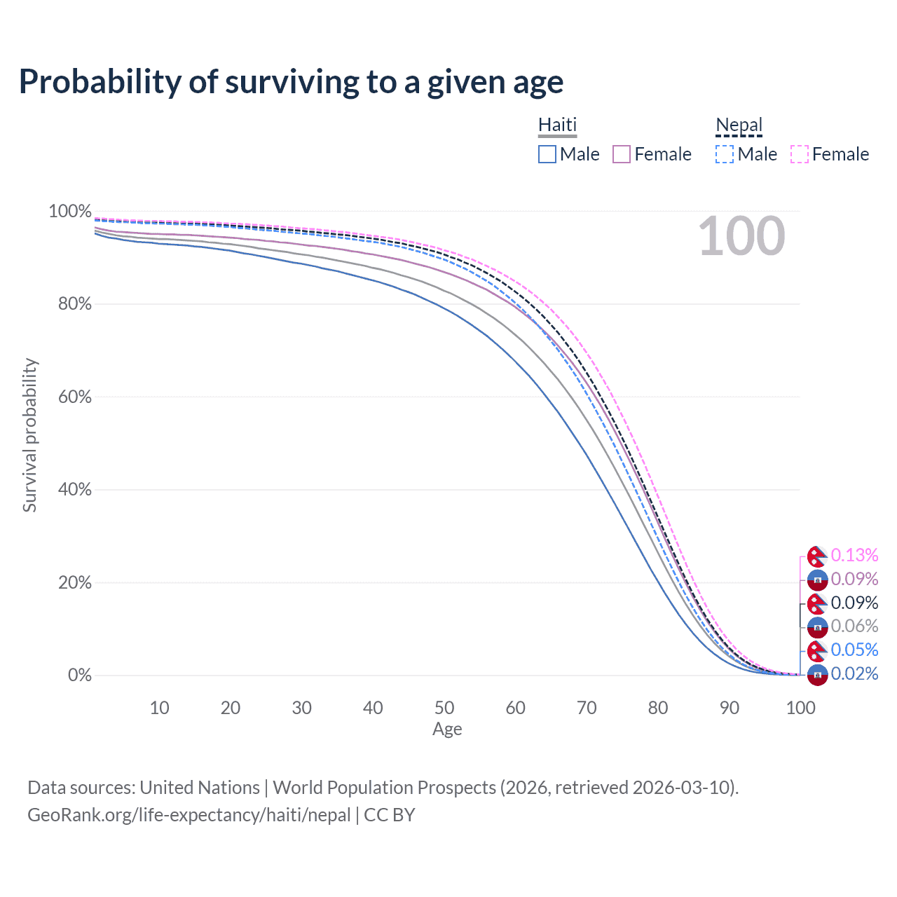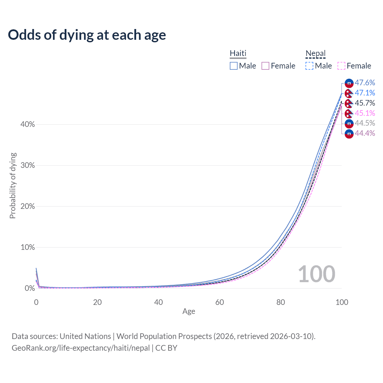 This life expectancy calculator shows the odds of living to 100, 95, 90, and below based on current age for both males and females in Haiti and Nepal, along with mean and median age of death. The calculations are based on the 2026 life tables (actuarial tables) from the UN World Population Prospects.