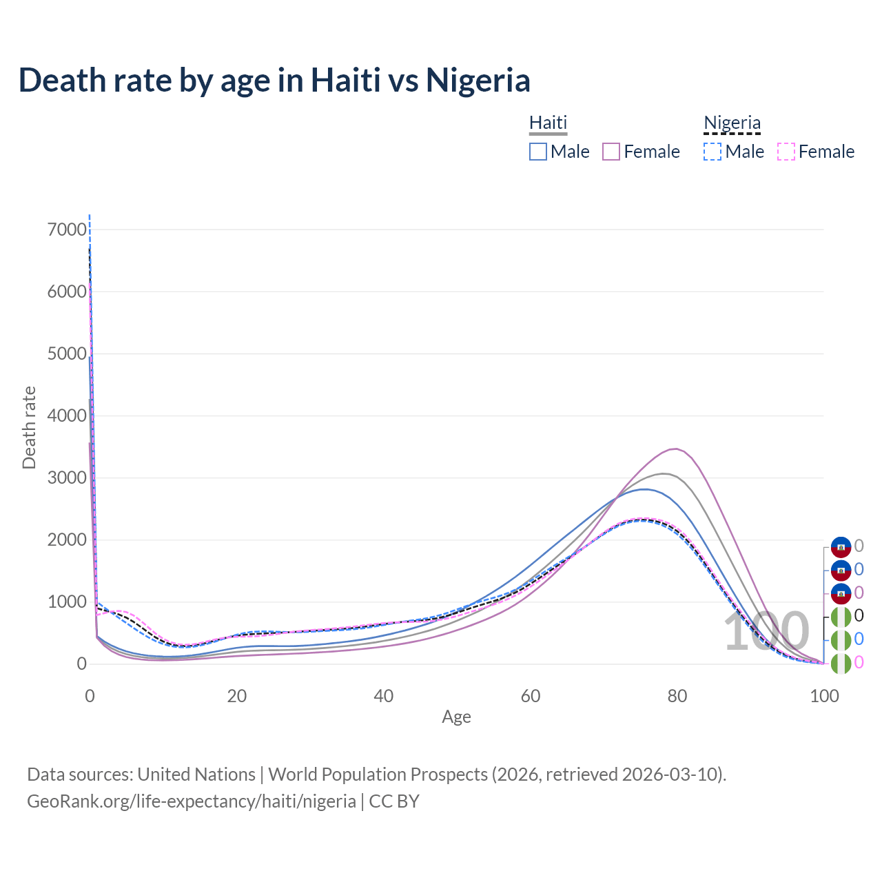 In Haiti, the most common age of death is 0, compared to 0 in Nigeria. The median age of death is 72 in Haiti and 64.3 in Nigeria, meaning only half of each cohort is expected to live past that age.