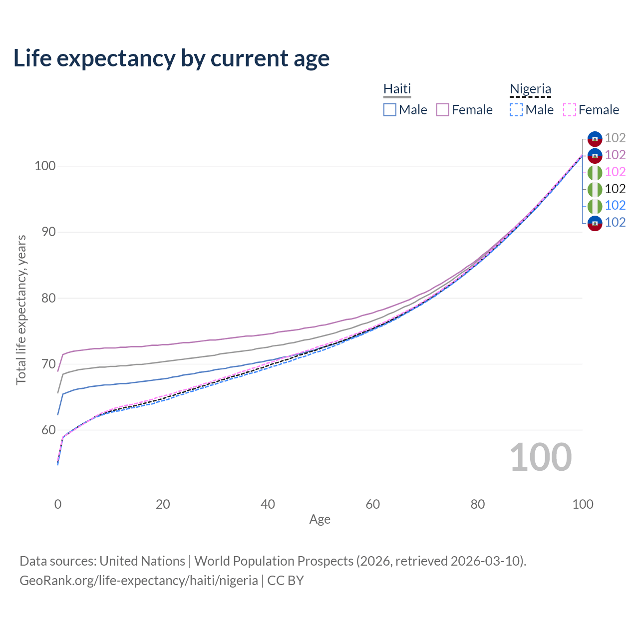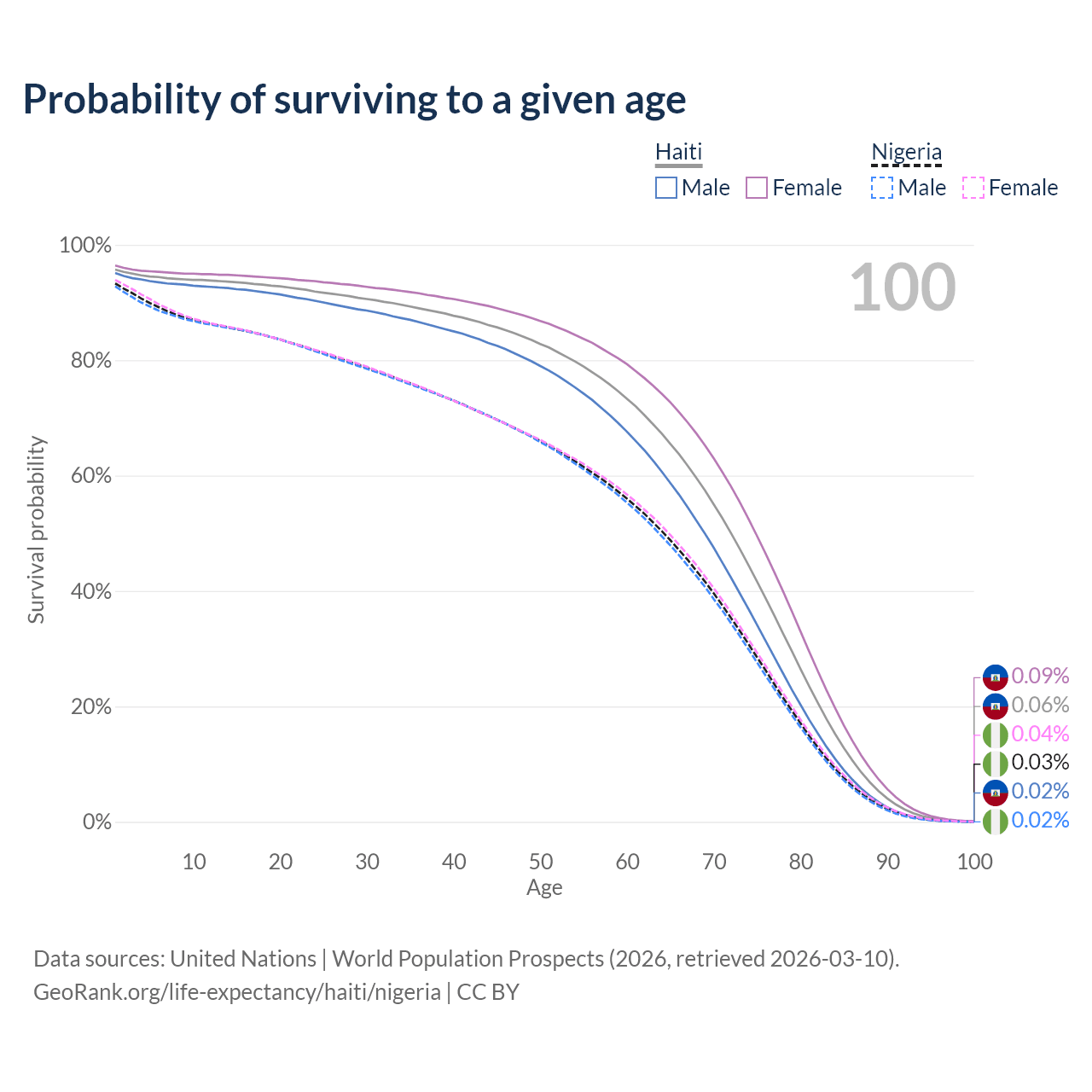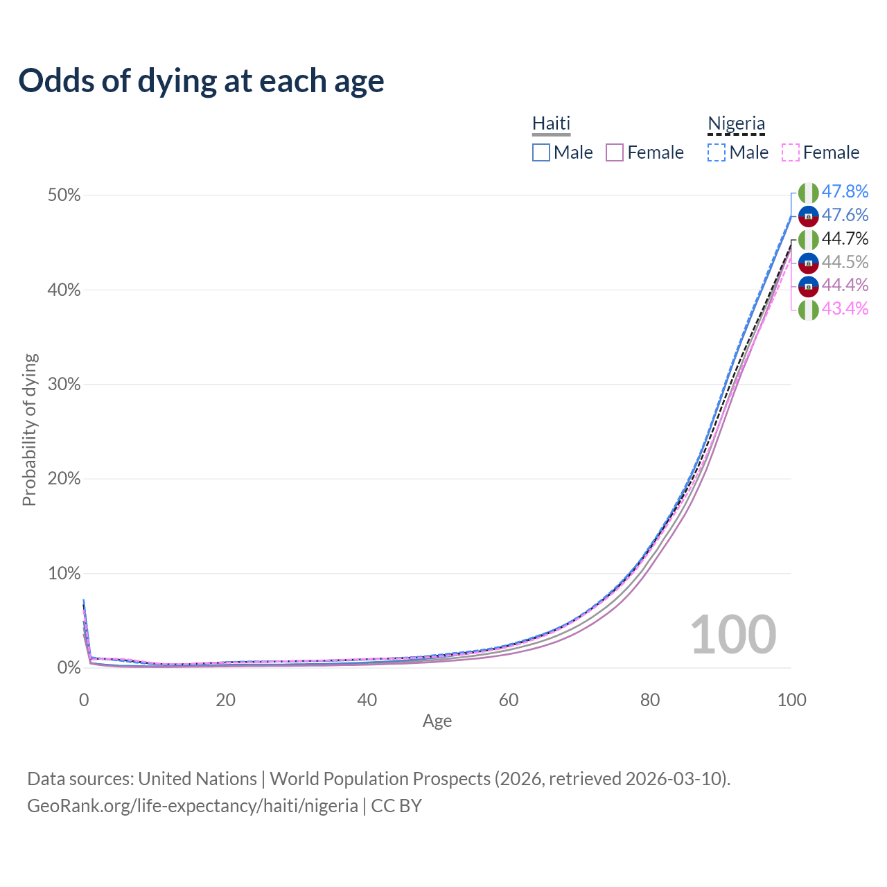 This life expectancy calculator shows the odds of living to 100, 95, 90, and below based on current age for both males and females in Haiti and Nigeria, along with mean and median age of death. The calculations are based on the 2026 life tables (actuarial tables) from the UN World Population Prospects.