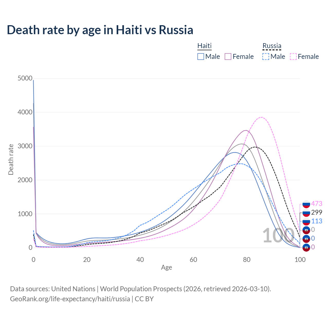 In Haiti, the most common age of death is 0, compared to 83 in Russia. The median age of death is 72 in Haiti and 77.5 in Russia, meaning only half of each cohort is expected to live past that age.