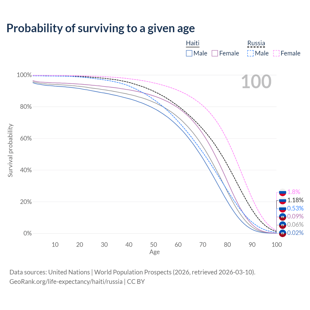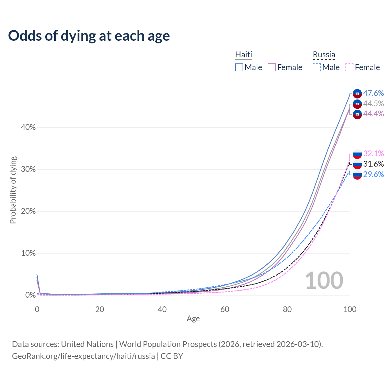 This life expectancy calculator shows the odds of living to 100, 95, 90, and below based on current age for both males and females in Haiti and Russia, along with mean and median age of death. The calculations are based on the 2026 life tables (actuarial tables) from the UN World Population Prospects.