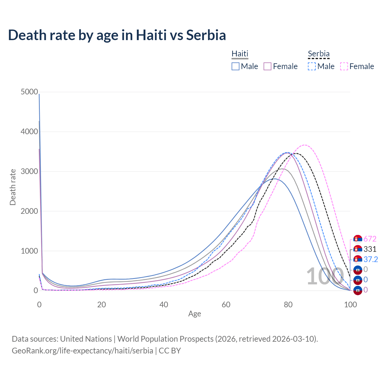 In Haiti, the most common age of death is 0, compared to 83 in Serbia. The median age of death is 72 in Haiti and 79.6 in Serbia, meaning only half of each cohort is expected to live past that age.