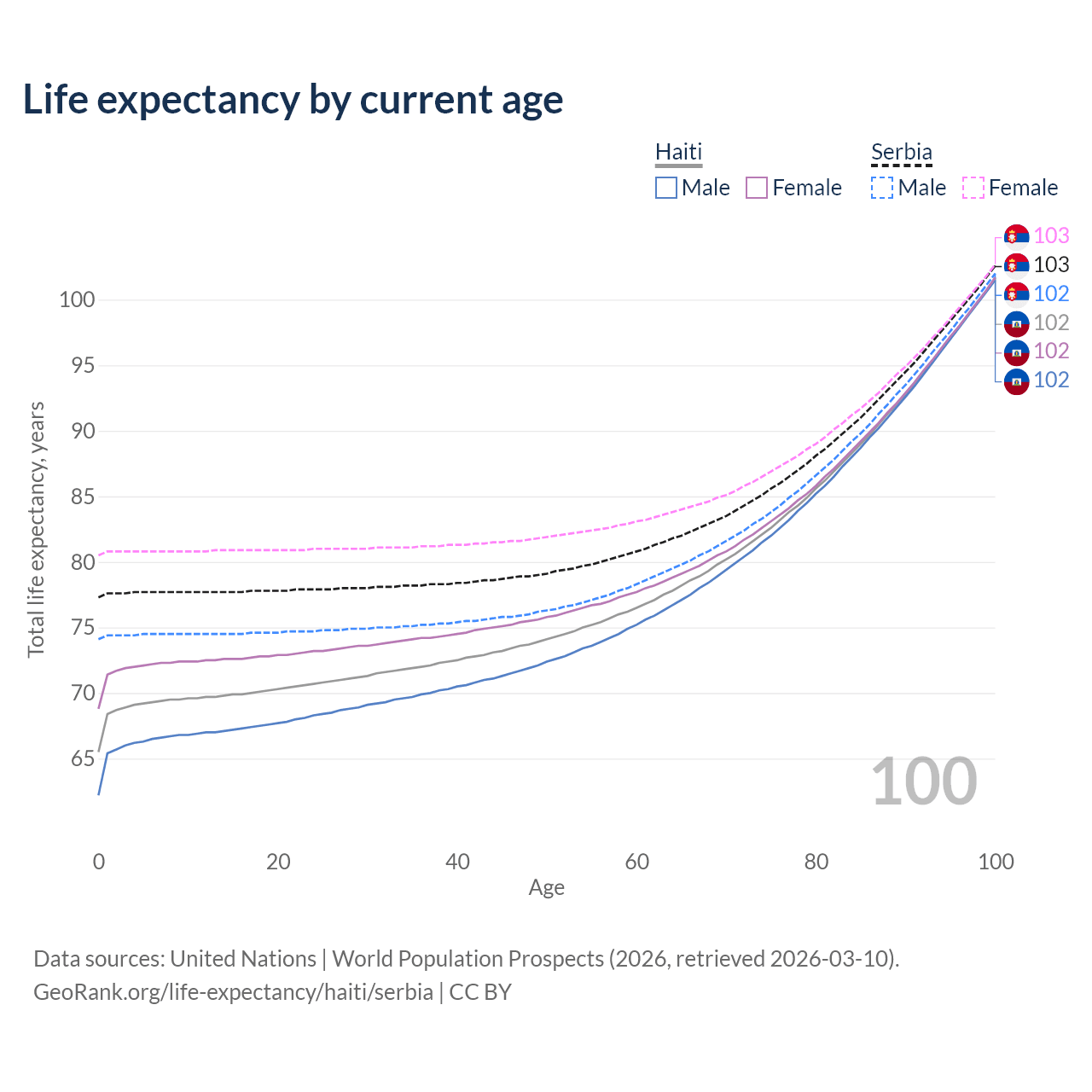 This life expectancy calculator shows the odds of living to 100, 95, 90, and below based on current age for both males and females in Haiti and Serbia, along with mean and median age of death. The calculations are based on the 2026 life tables (actuarial tables) from the UN World Population Prospects.