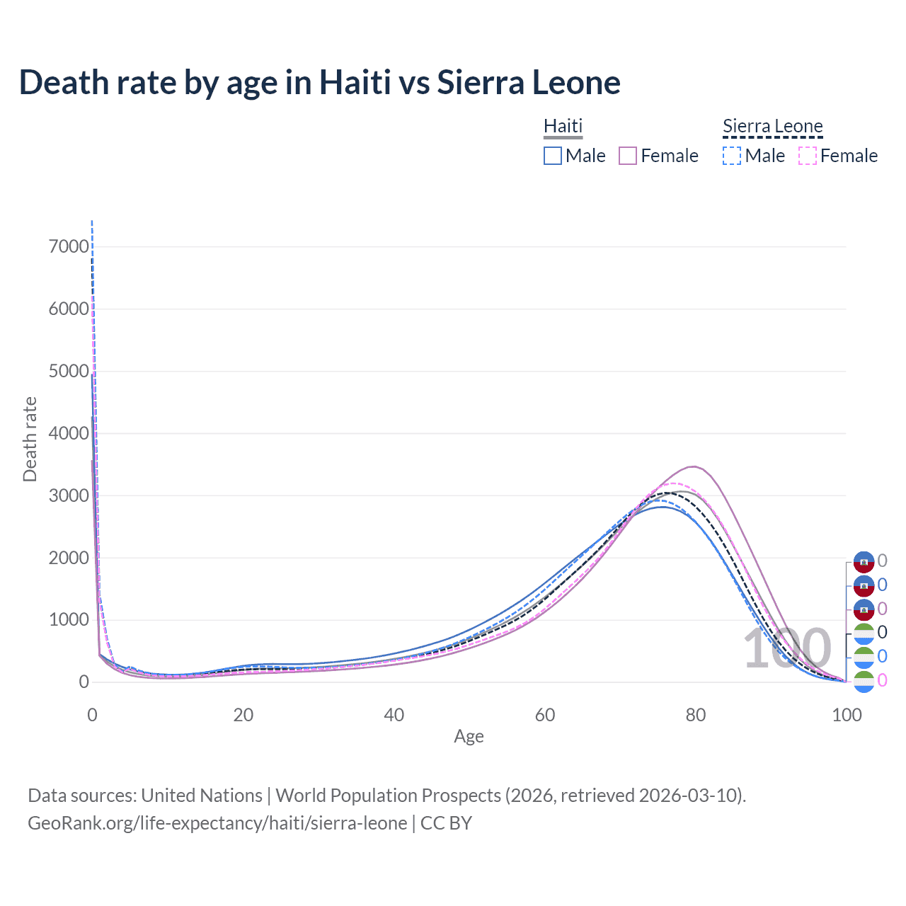 In Haiti, the most common age of death is 0, compared to 0 in Sierra Leone. The median age of death is 72 in Haiti and 70.8 in Sierra Leone, meaning only half of each cohort is expected to live past that age.