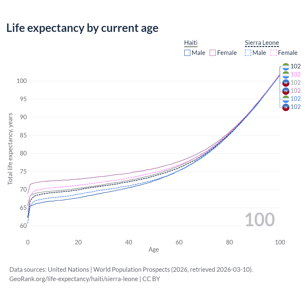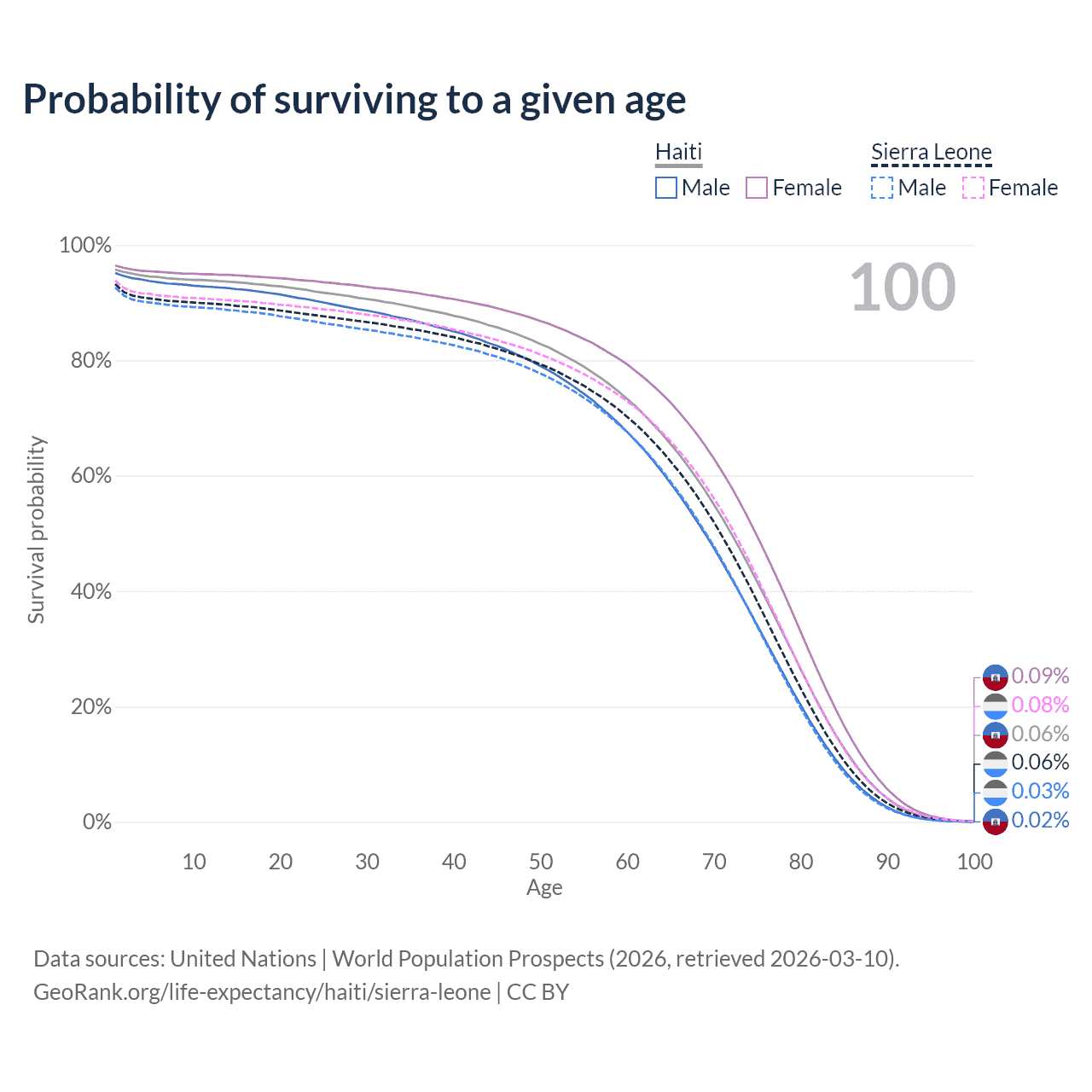 This life expectancy calculator shows the odds of living to 100, 95, 90, and below based on current age for both males and females in Haiti and Sierra Leone, along with mean and median age of death. The calculations are based on the 2026 life tables (actuarial tables) from the UN World Population Prospects.