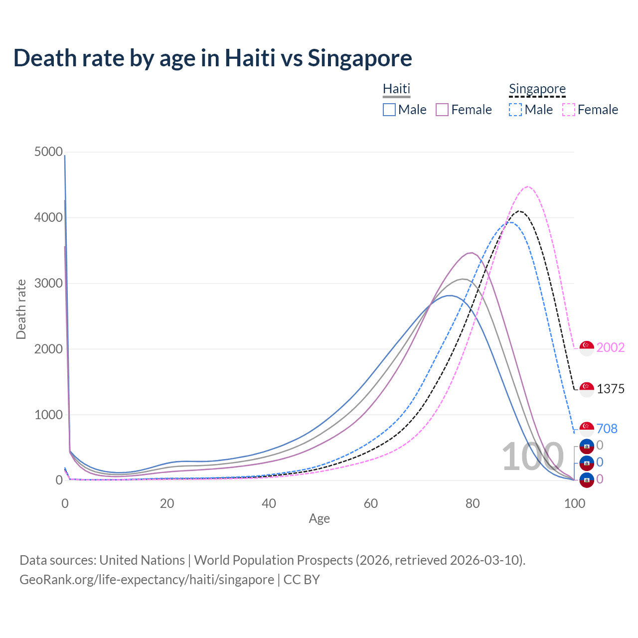 In Haiti, the most common age of death is 0, compared to 89 in Singapore. The median age of death is 72 in Haiti and 86.5 in Singapore, meaning only half of each cohort is expected to live past that age.
