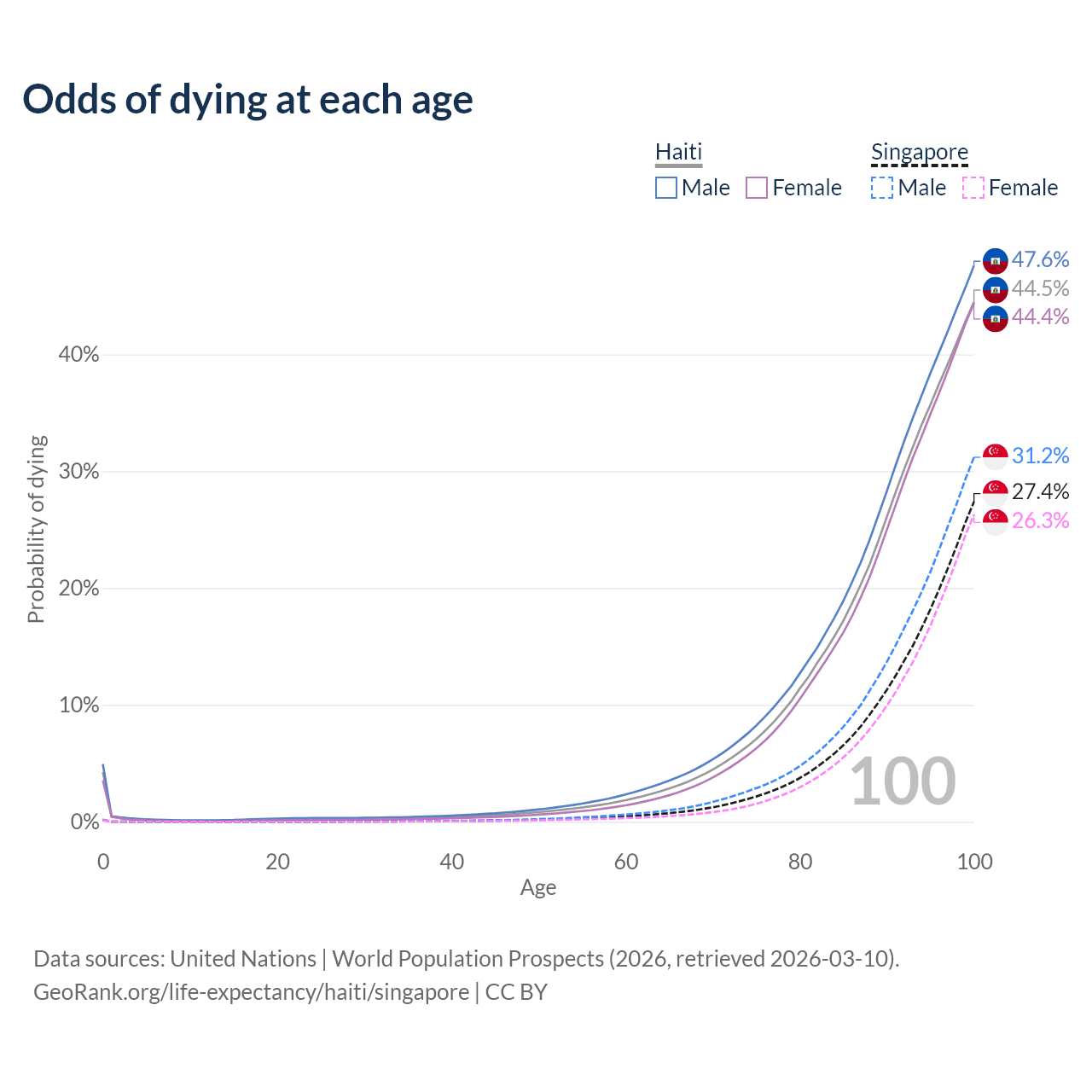 This life expectancy calculator shows the odds of living to 100, 95, 90, and below based on current age for both males and females in Haiti and Singapore, along with mean and median age of death. The calculations are based on the 2026 life tables (actuarial tables) from the UN World Population Prospects.