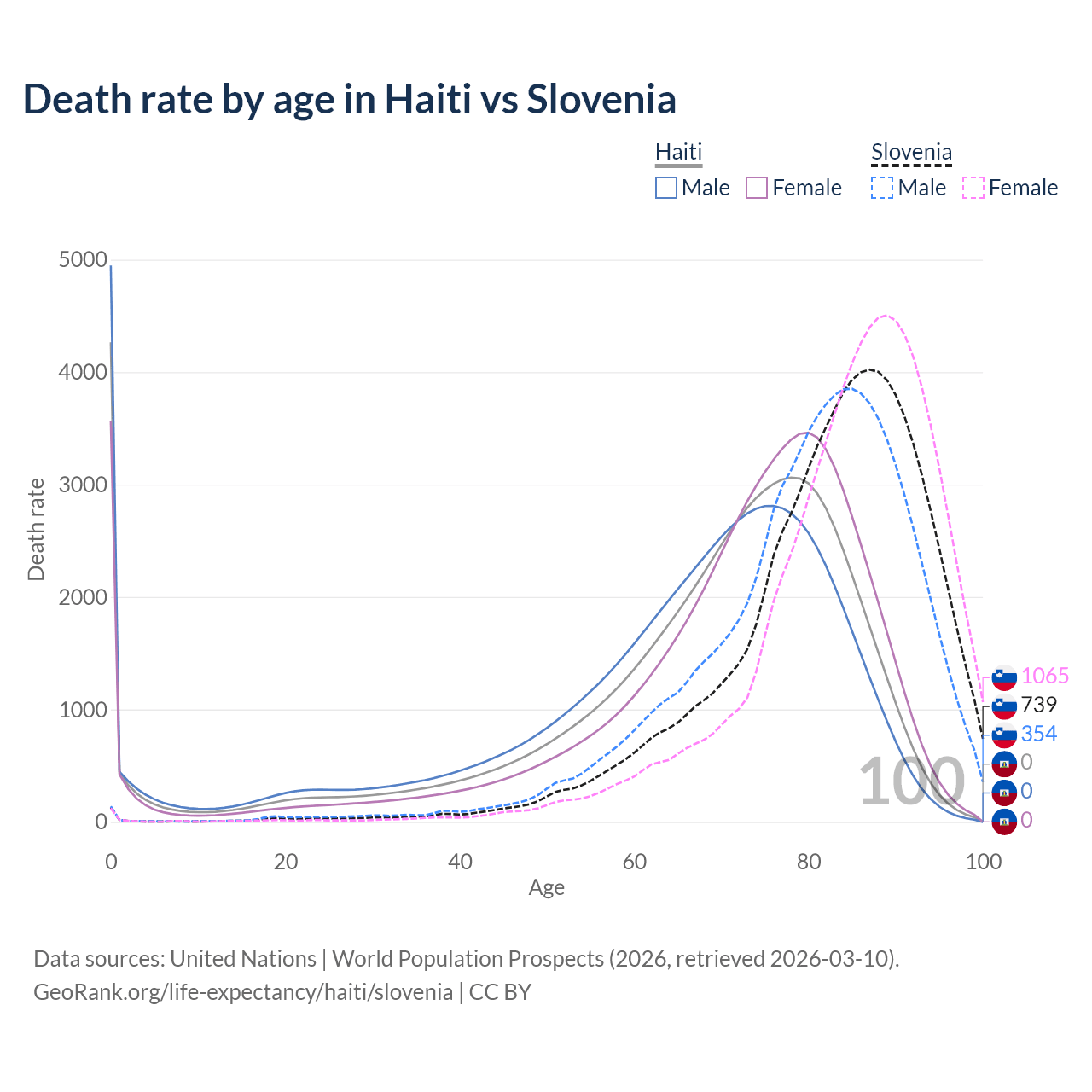 In Haiti, the most common age of death is 0, compared to 87 in Slovenia. The median age of death is 72 in Haiti and 84.4 in Slovenia, meaning only half of each cohort is expected to live past that age.