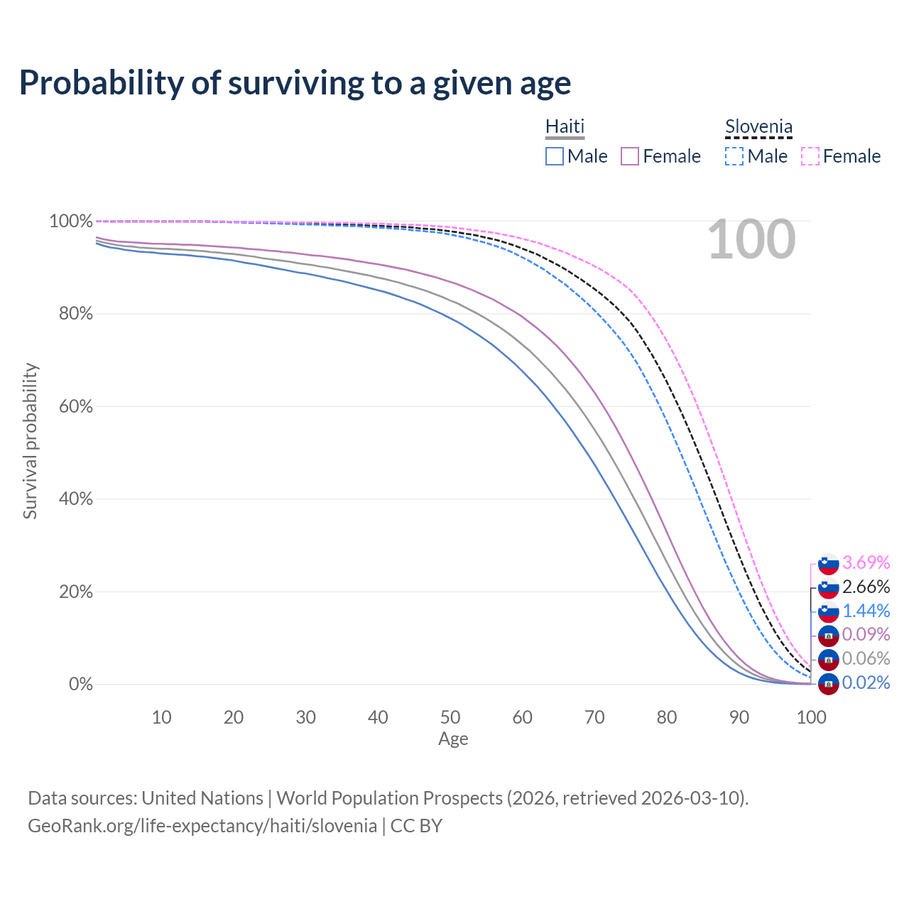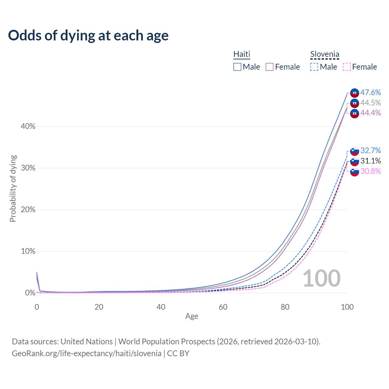 This life expectancy calculator shows the odds of living to 100, 95, 90, and below based on current age for both males and females in Haiti and Slovenia, along with mean and median age of death. The calculations are based on the 2026 life tables (actuarial tables) from the UN World Population Prospects.