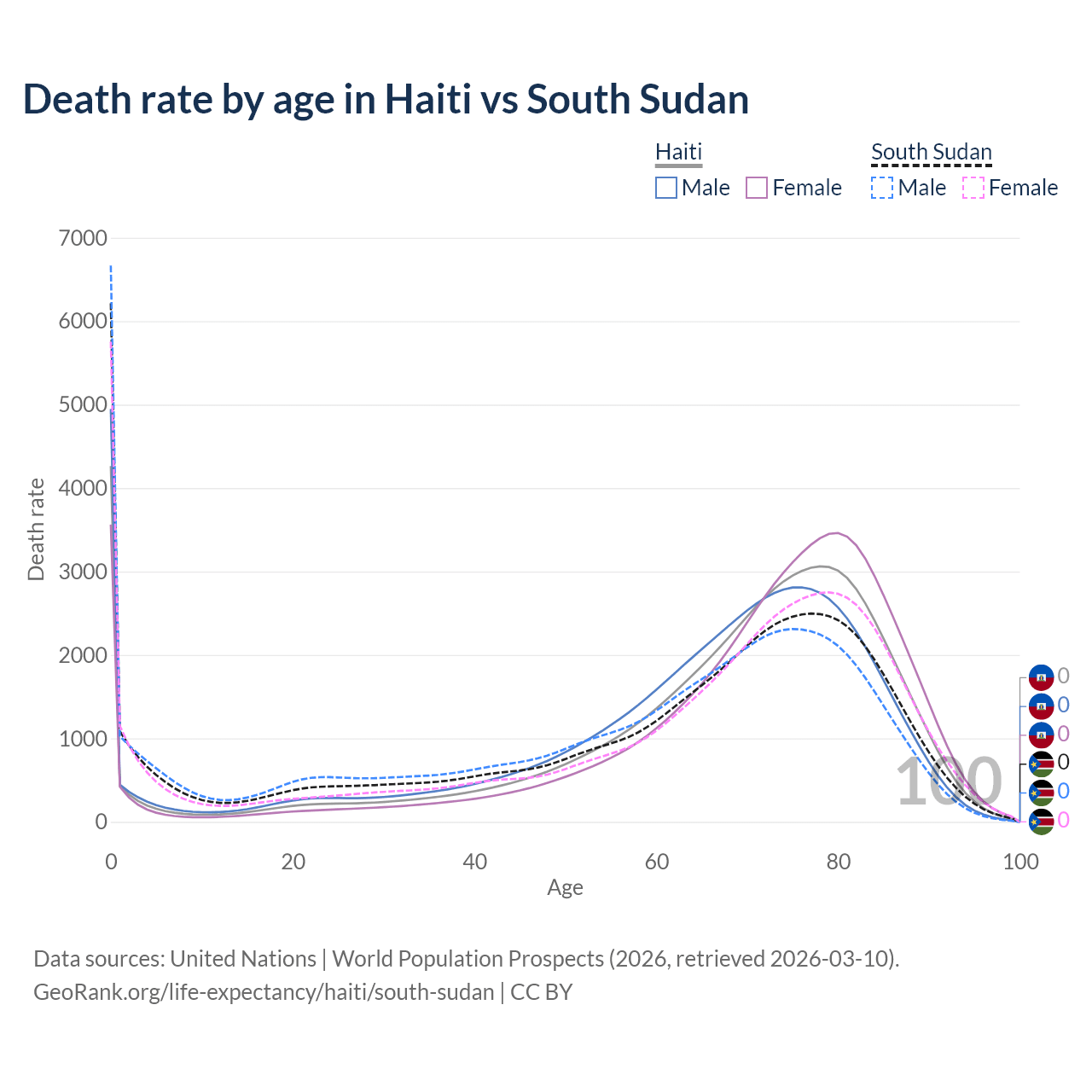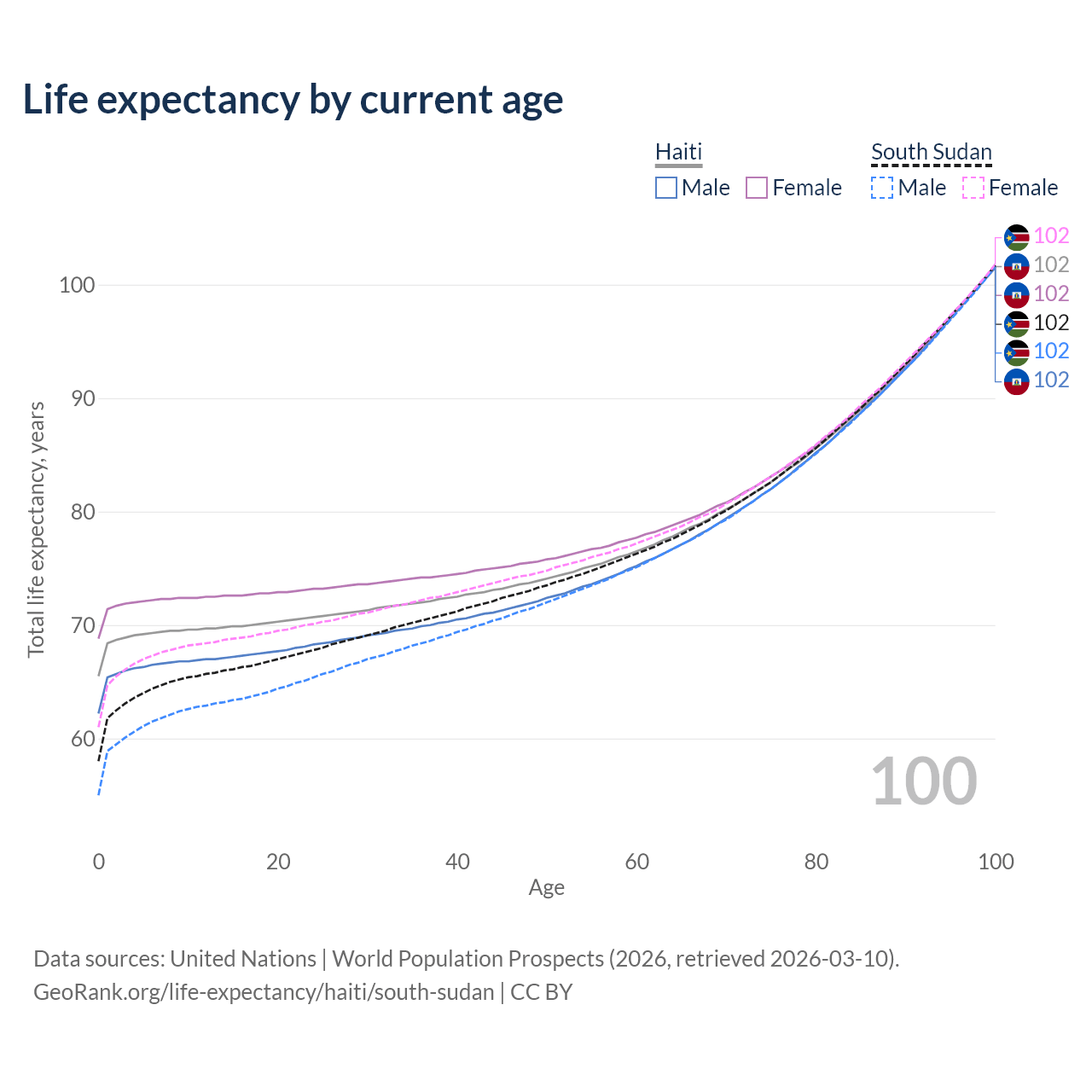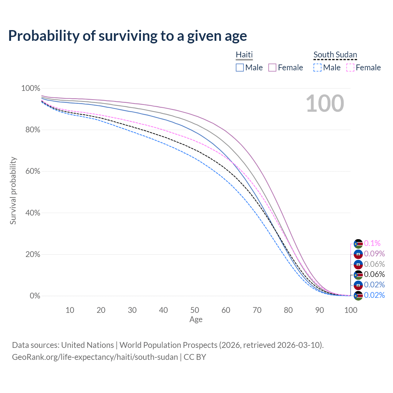 This life expectancy calculator shows the odds of living to 100, 95, 90, and below based on current age for both males and females in Haiti and South Sudan, along with mean and median age of death. The calculations are based on the 2026 life tables (actuarial tables) from the UN World Population Prospects.