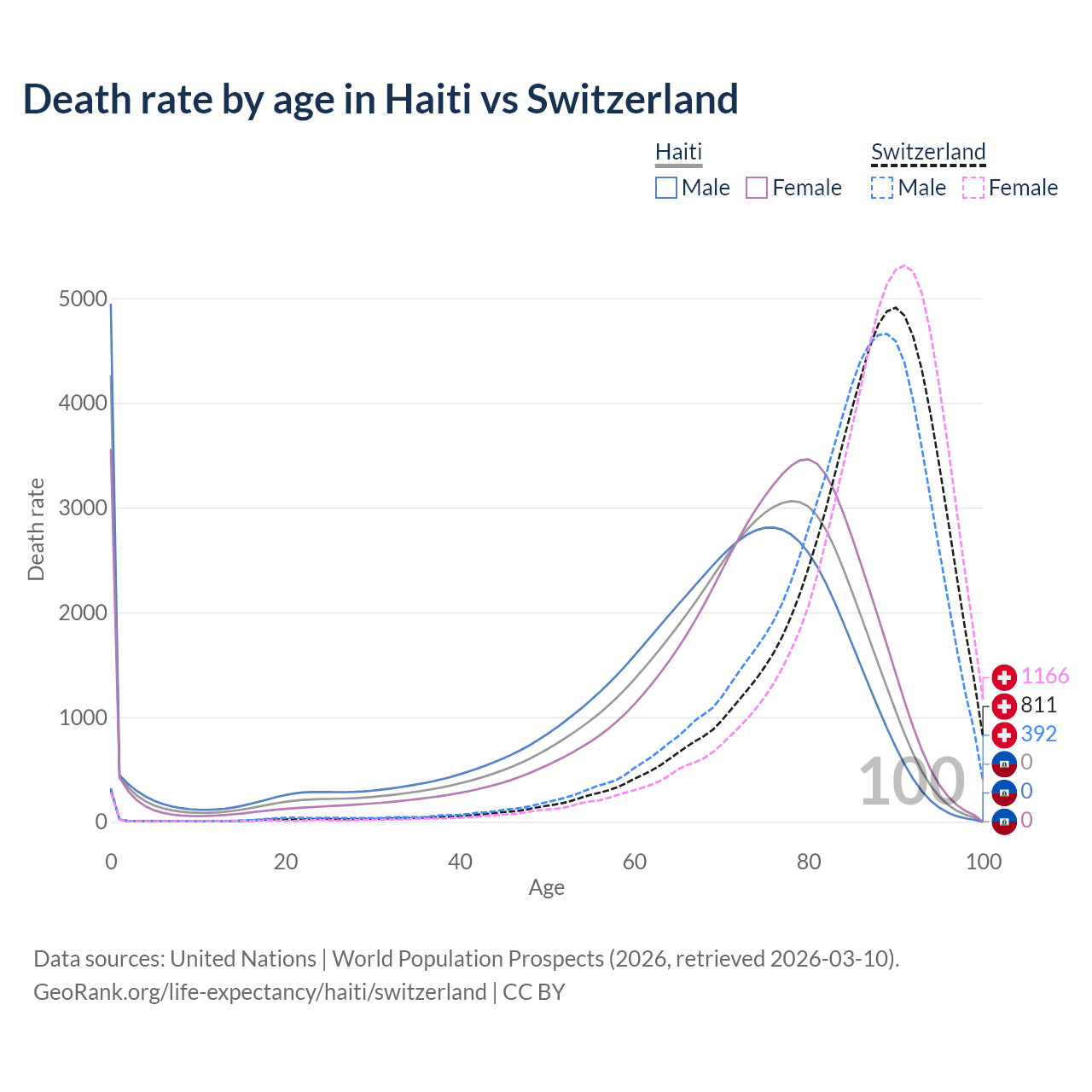 In Haiti, the most common age of death is 0, compared to 90 in Switzerland. The median age of death is 72 in Haiti and 87.2 in Switzerland, meaning only half of each cohort is expected to live past that age.