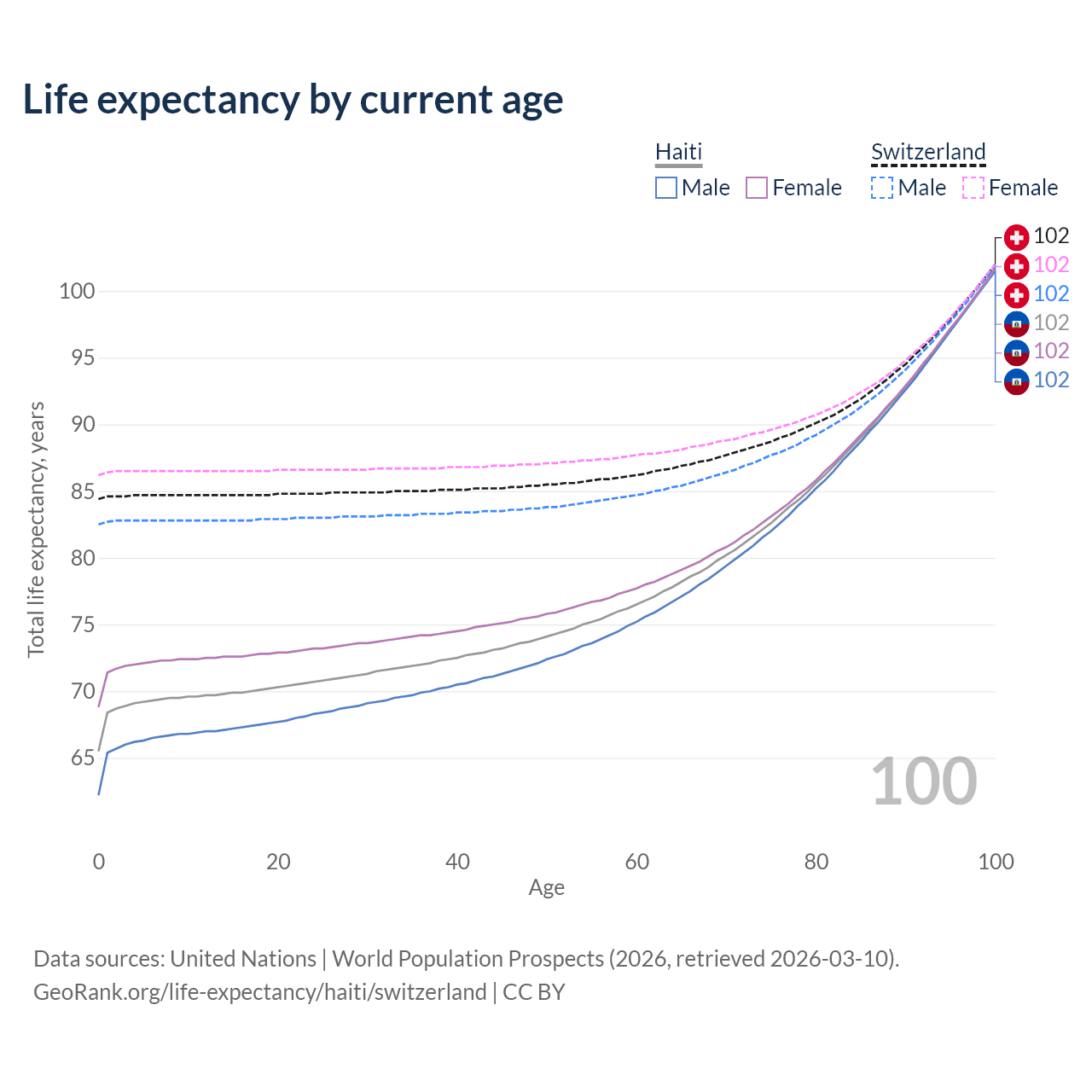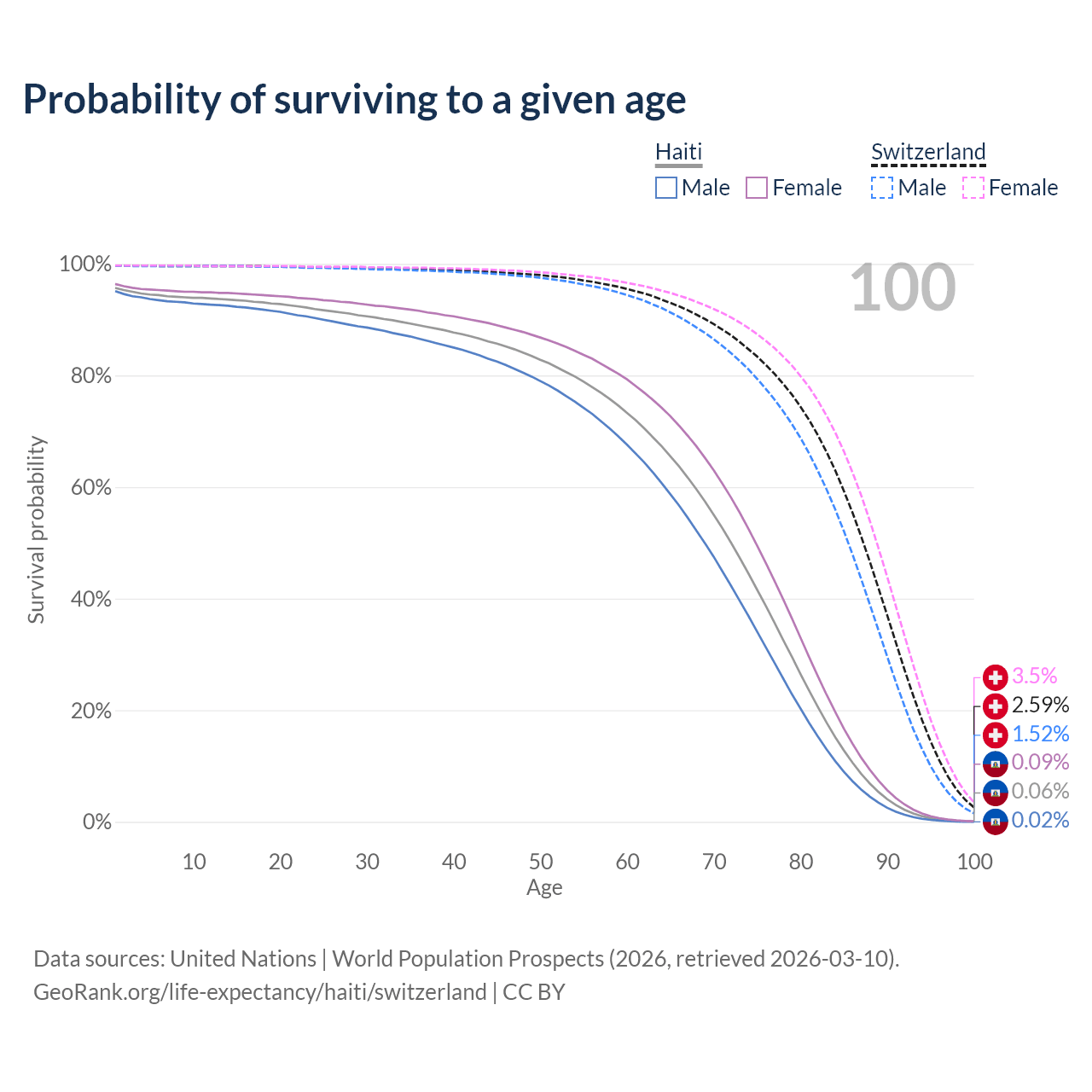 This life expectancy calculator shows the odds of living to 100, 95, 90, and below based on current age for both males and females in Haiti and Switzerland, along with mean and median age of death. The calculations are based on the 2026 life tables (actuarial tables) from the UN World Population Prospects.