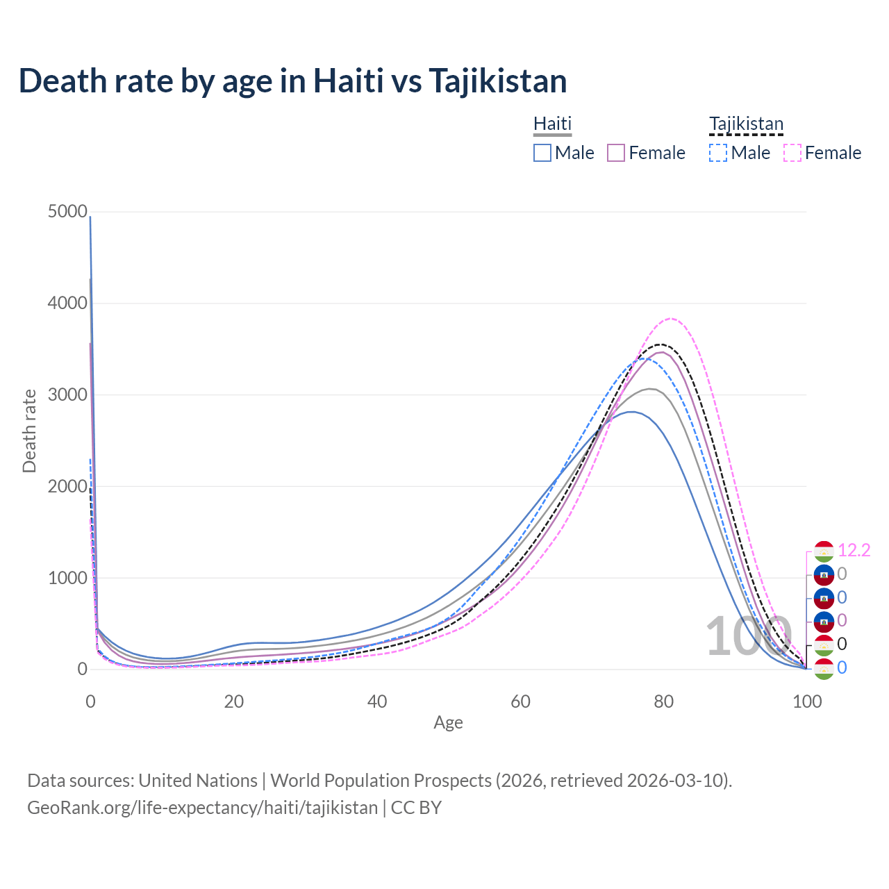 In Haiti, the most common age of death is 0, compared to 80 in Tajikistan. The median age of death is 72 in Haiti and 76 in Tajikistan, meaning only half of each cohort is expected to live past that age.