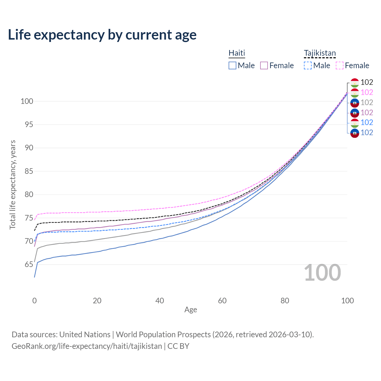 This life expectancy calculator shows the odds of living to 100, 95, 90, and below based on current age for both males and females in Haiti and Tajikistan, along with mean and median age of death. The calculations are based on the 2026 life tables (actuarial tables) from the UN World Population Prospects.