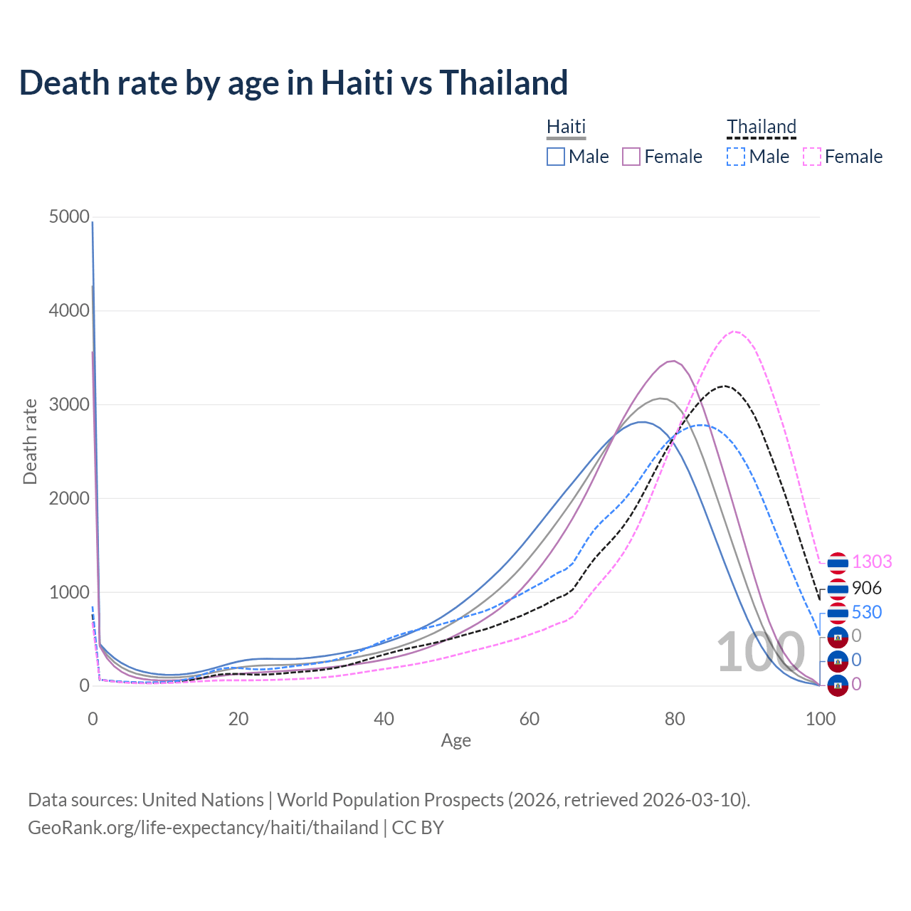 In Haiti, the most common age of death is 0, compared to 87 in Thailand. The median age of death is 72 in Haiti and 81.8 in Thailand, meaning only half of each cohort is expected to live past that age.