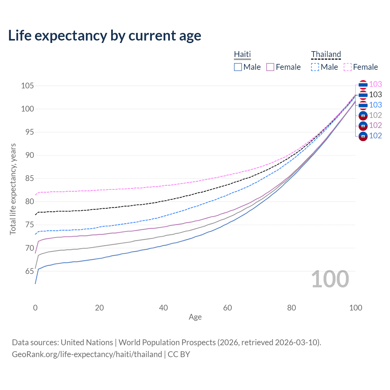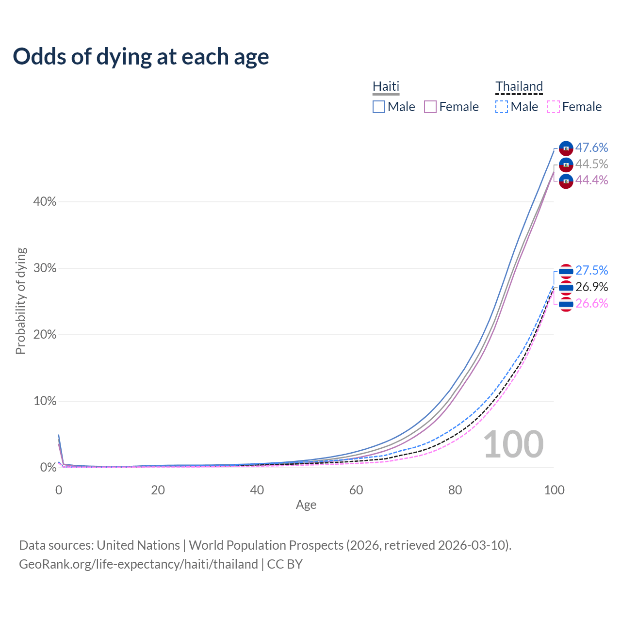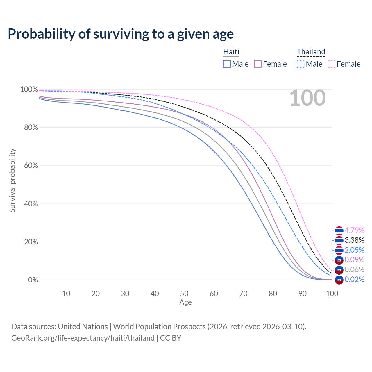 This life expectancy calculator shows the odds of living to 100, 95, 90, and below based on current age for both males and females in Haiti and Thailand, along with mean and median age of death. The calculations are based on the 2026 life tables (actuarial tables) from the UN World Population Prospects.