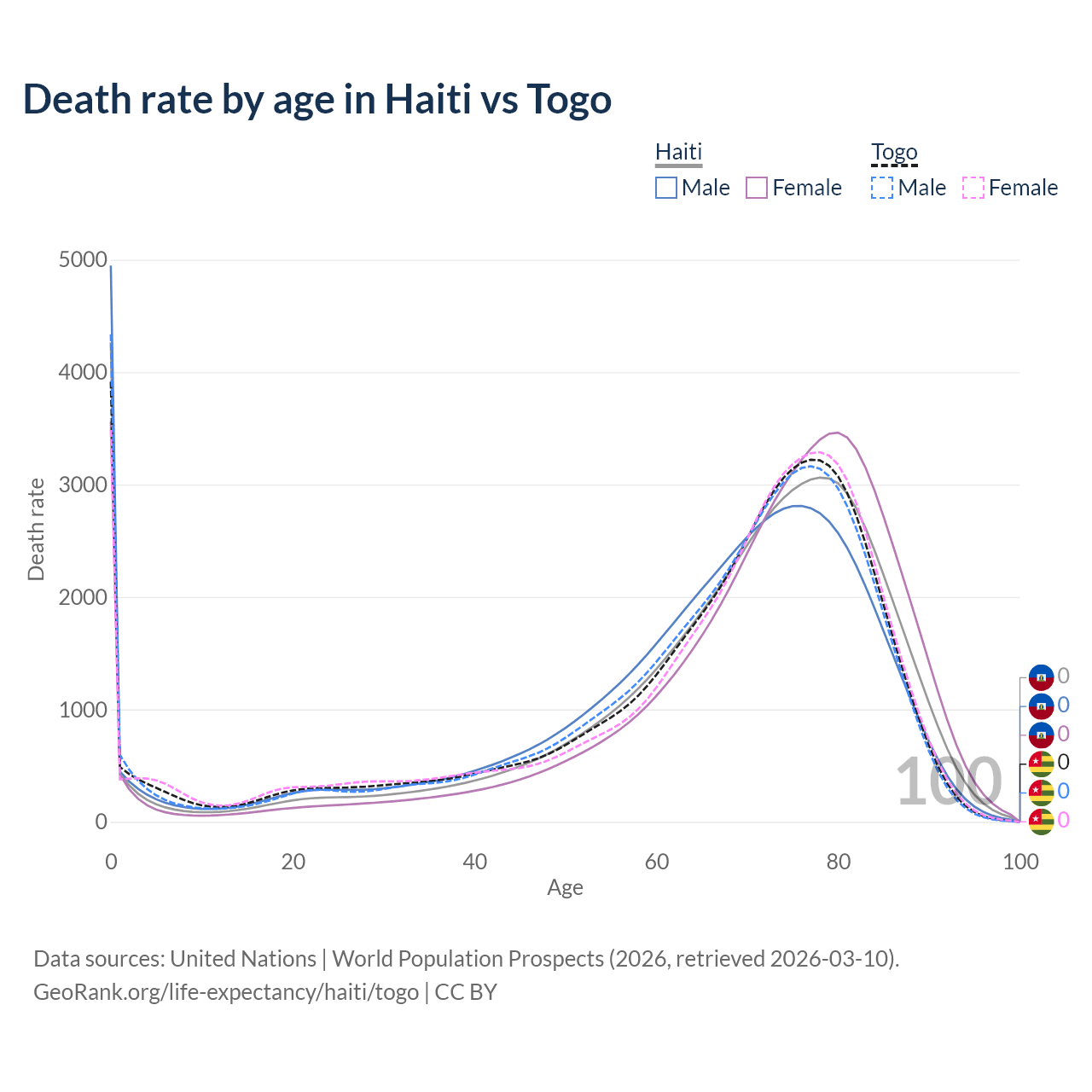 In Haiti, the most common age of death is 0, compared to 0 in Togo. The median age of death is 72 in Haiti and 71 in Togo, meaning only half of each cohort is expected to live past that age.