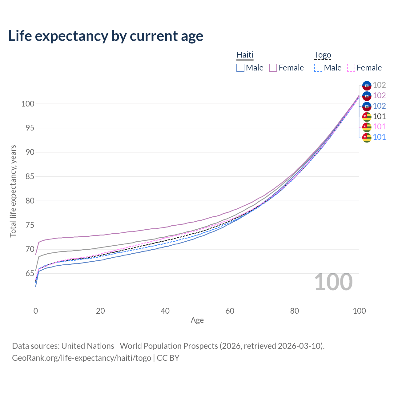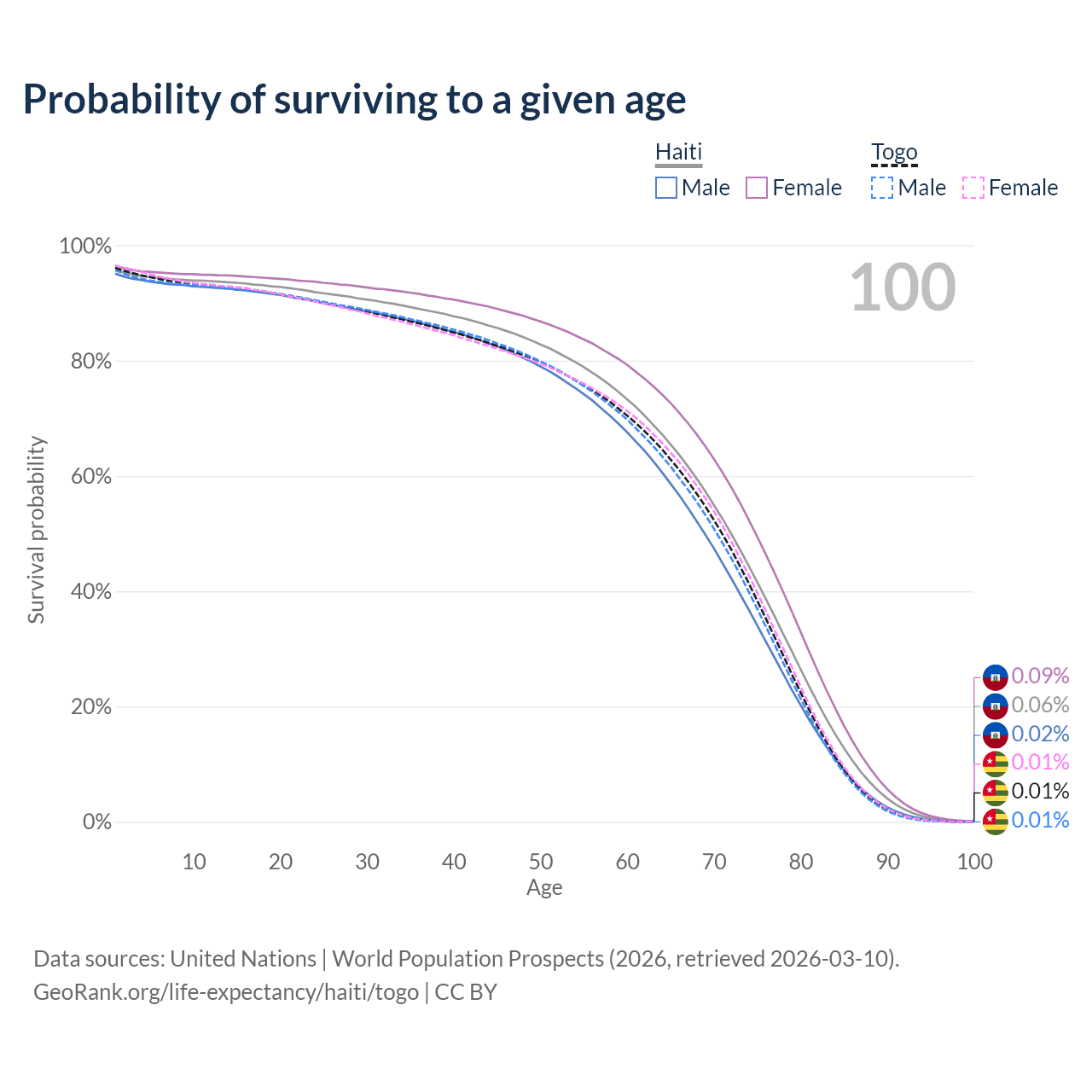 This life expectancy calculator shows the odds of living to 100, 95, 90, and below based on current age for both males and females in Haiti and Togo, along with mean and median age of death. The calculations are based on the 2026 life tables (actuarial tables) from the UN World Population Prospects.