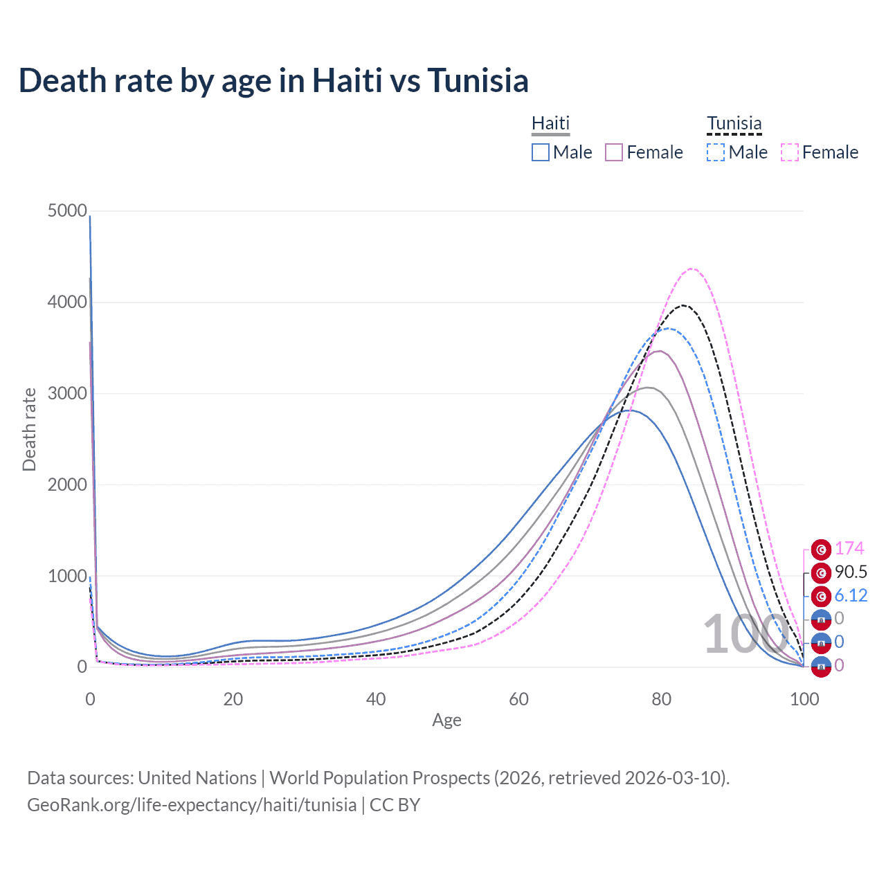 In Haiti, the most common age of death is 0, compared to 83 in Tunisia. The median age of death is 72 in Haiti and 80.2 in Tunisia, meaning only half of each cohort is expected to live past that age.