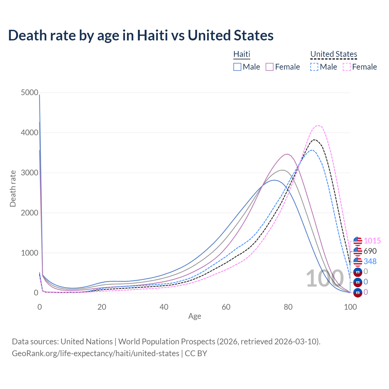 In Haiti, the most common age of death is 0, compared to 89 in the United States. The median age of death is 72 in Haiti and 83.9 in the United States, meaning only half of each cohort is expected to live past that age.