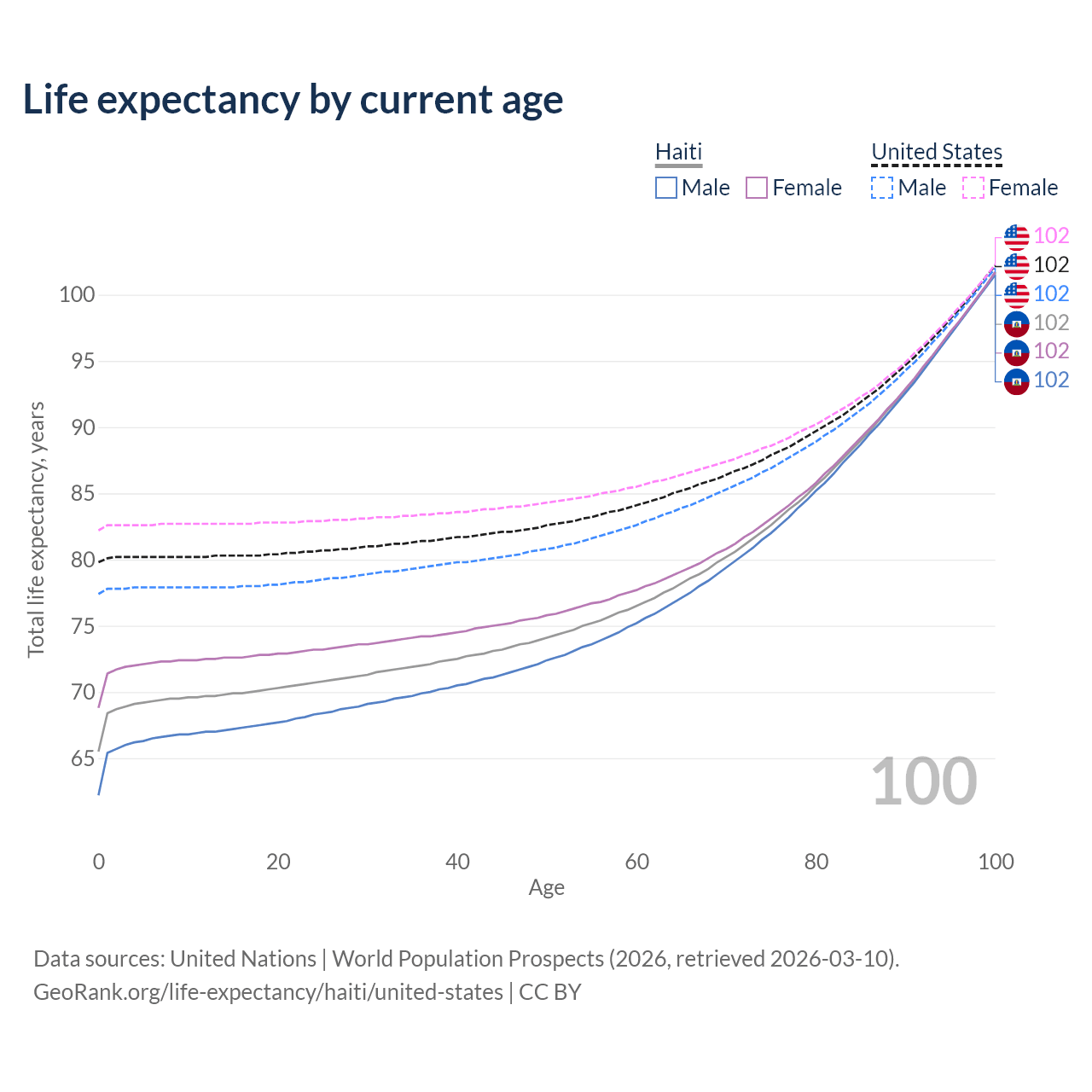 This life expectancy calculator shows the odds of living to 100, 95, 90, and below based on current age for both males and females in Haiti and the United States, along with mean and median age of death. The calculations are based on the 2026 life tables (actuarial tables) from the UN World Population Prospects.