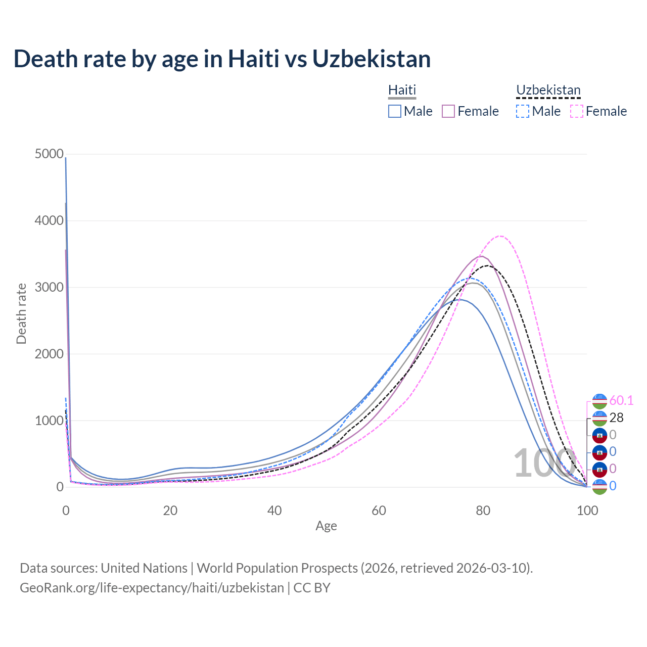 In Haiti, the most common age of death is 0, compared to 81 in Uzbekistan. The median age of death is 72 in Haiti and 76.4 in Uzbekistan, meaning only half of each cohort is expected to live past that age.