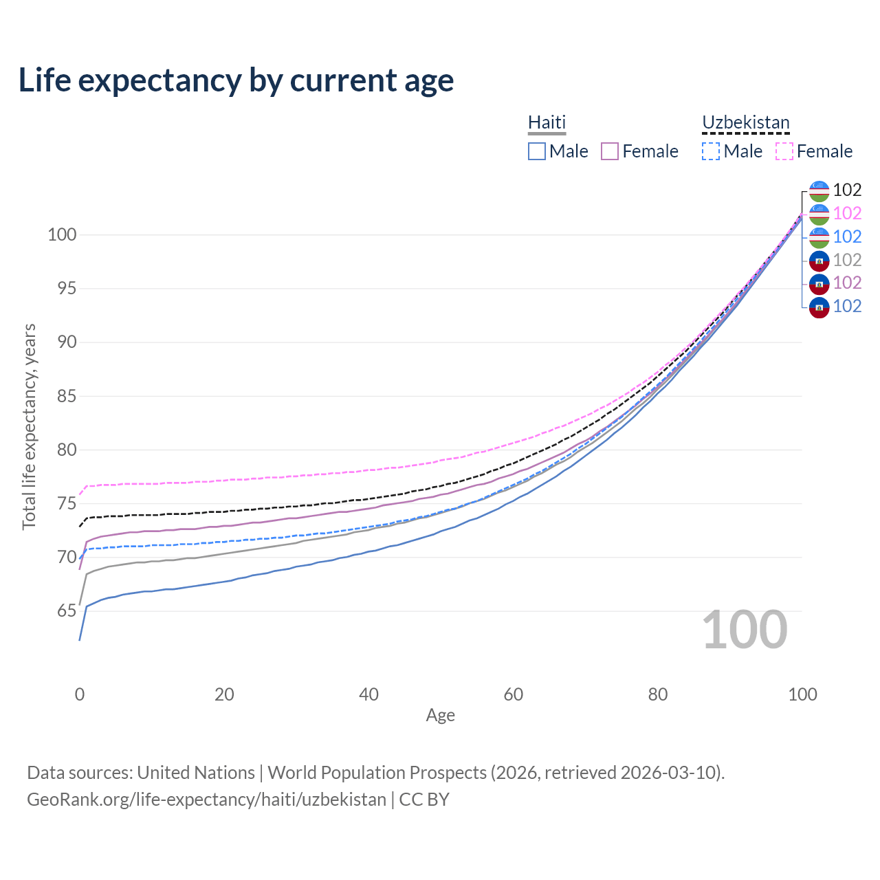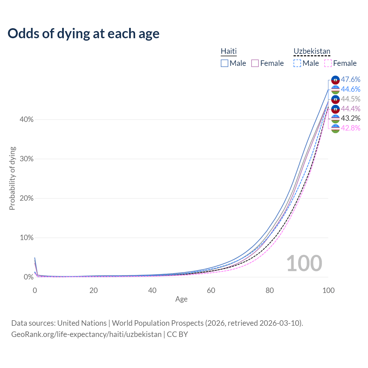 This life expectancy calculator shows the odds of living to 100, 95, 90, and below based on current age for both males and females in Haiti and Uzbekistan, along with mean and median age of death. The calculations are based on the 2026 life tables (actuarial tables) from the UN World Population Prospects.