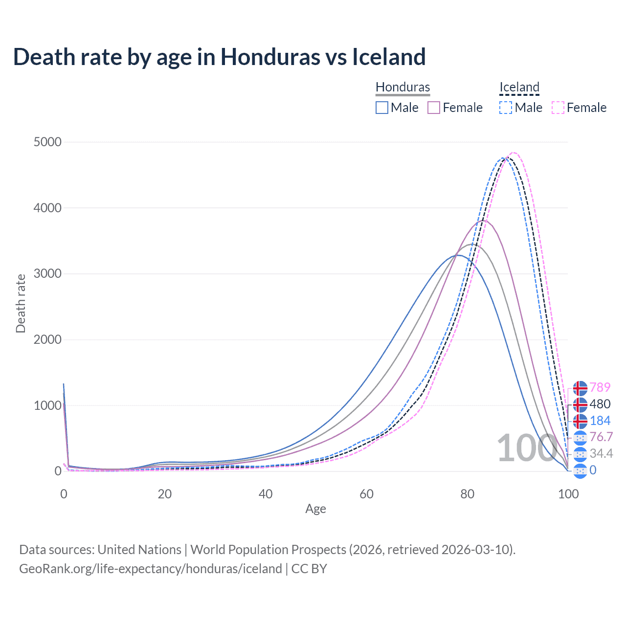 In Honduras, the most common age of death is 81, compared to 88 in Iceland. The median age of death is 77.1 in Honduras and 85.9 in Iceland, meaning only half of each cohort is expected to live past that age.