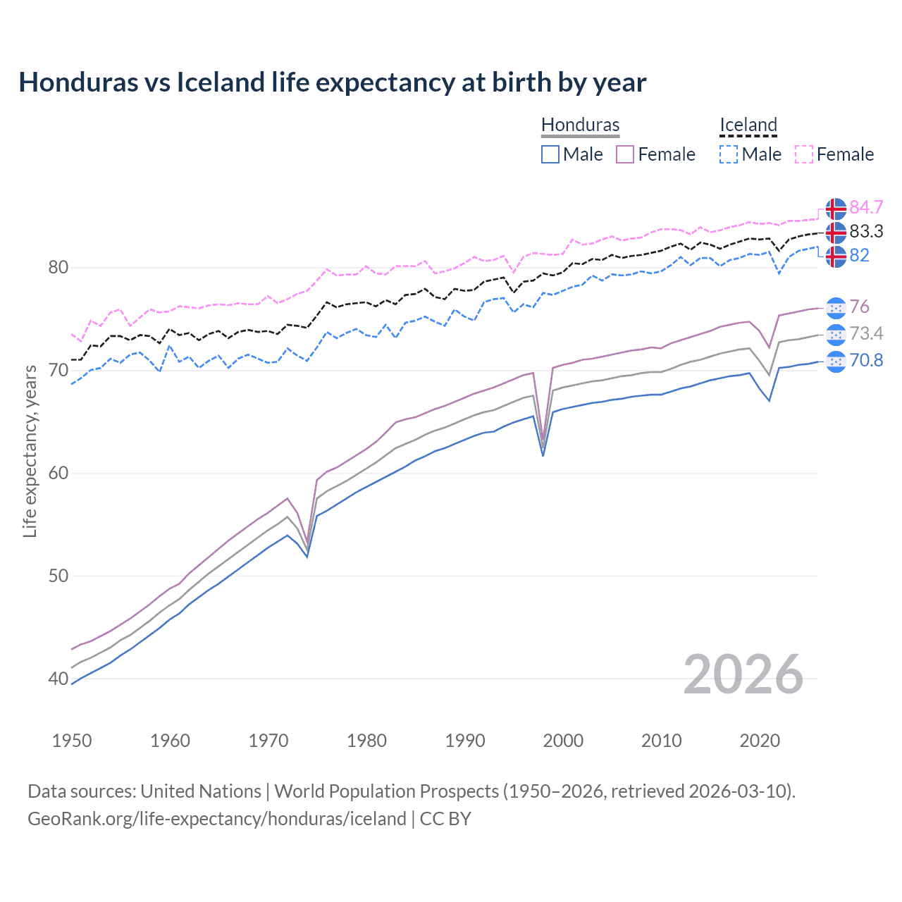 The average life expectancy at birth is 73.4 years in Honduras vs 83.3 in Iceland. Honduras is ranked 110/197 by life expectancy, and Iceland is 18/197. In Honduras, the life expectancy is 70.8 years for males and 76 years for females. In Iceland, it's 82 years for males and 84.7 years for females.