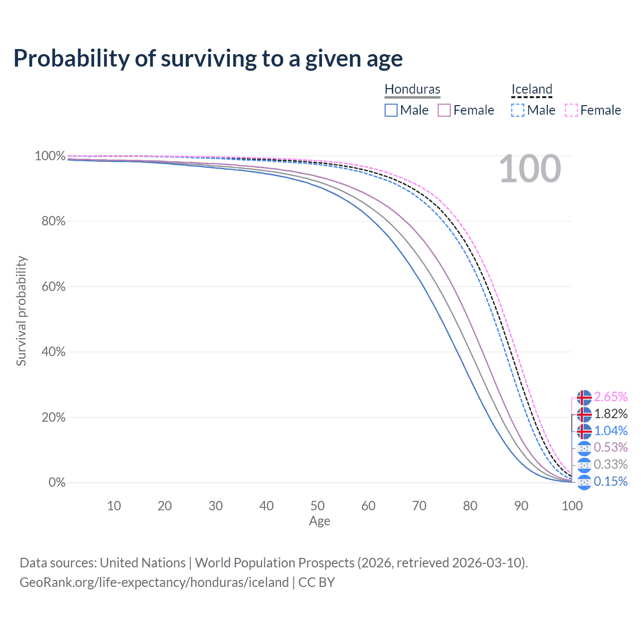 This life expectancy calculator shows the odds of living to 100, 95, 90, and below based on current age for both males and females in Honduras and Iceland, along with mean and median age of death. The calculations are based on the 2026 life tables (actuarial tables) from the UN World Population Prospects.