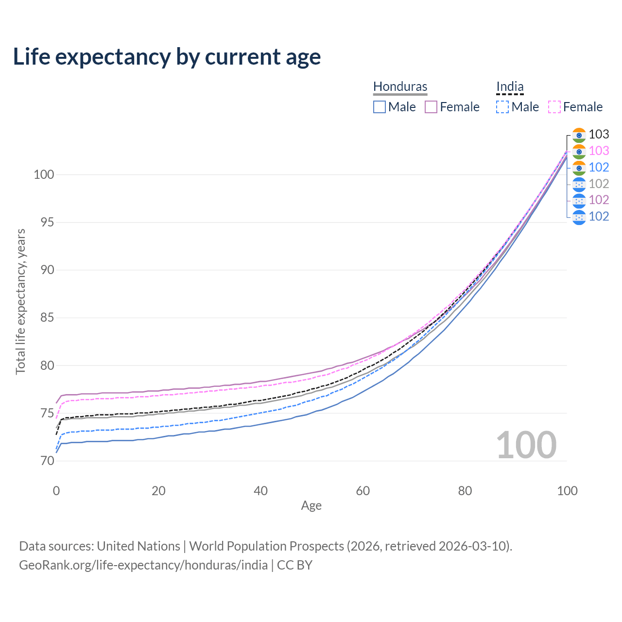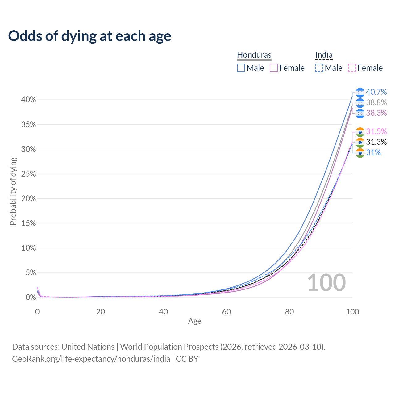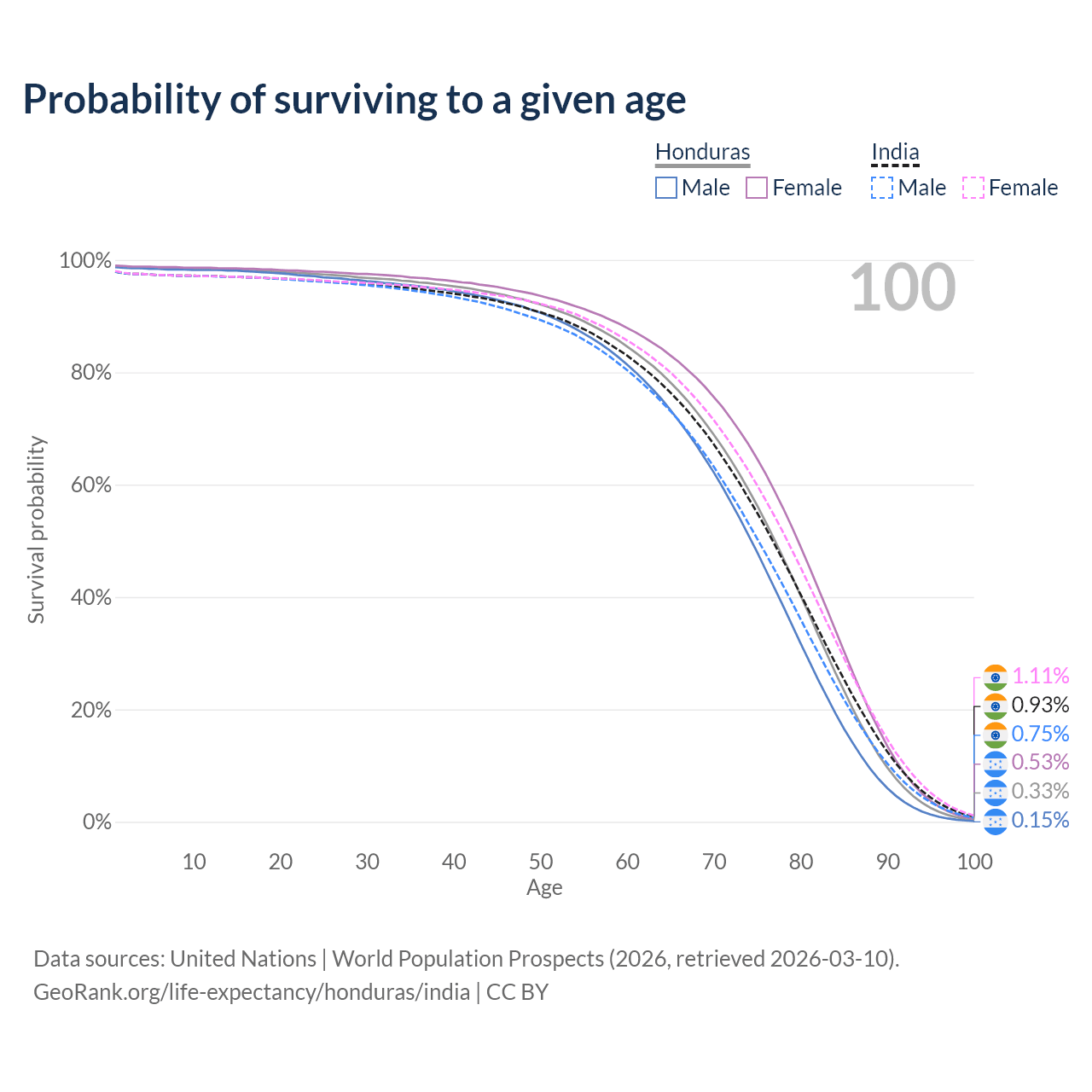 This life expectancy calculator shows the odds of living to 100, 95, 90, and below based on current age for both males and females in Honduras and India, along with mean and median age of death. The calculations are based on the 2026 life tables (actuarial tables) from the UN World Population Prospects.