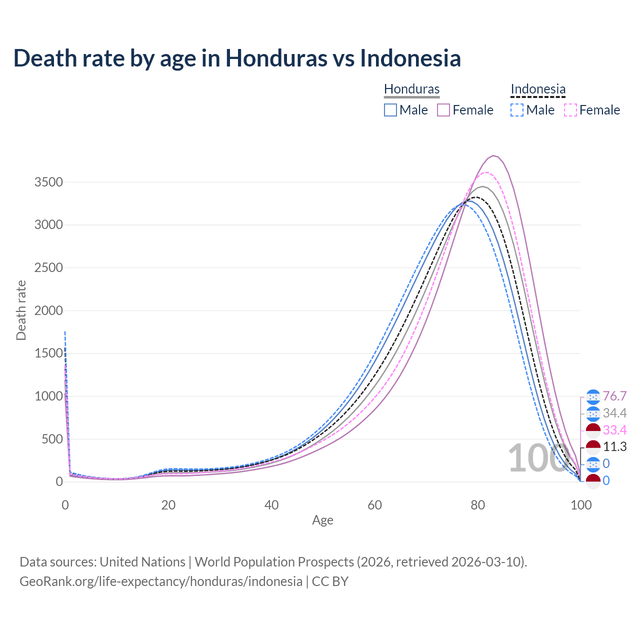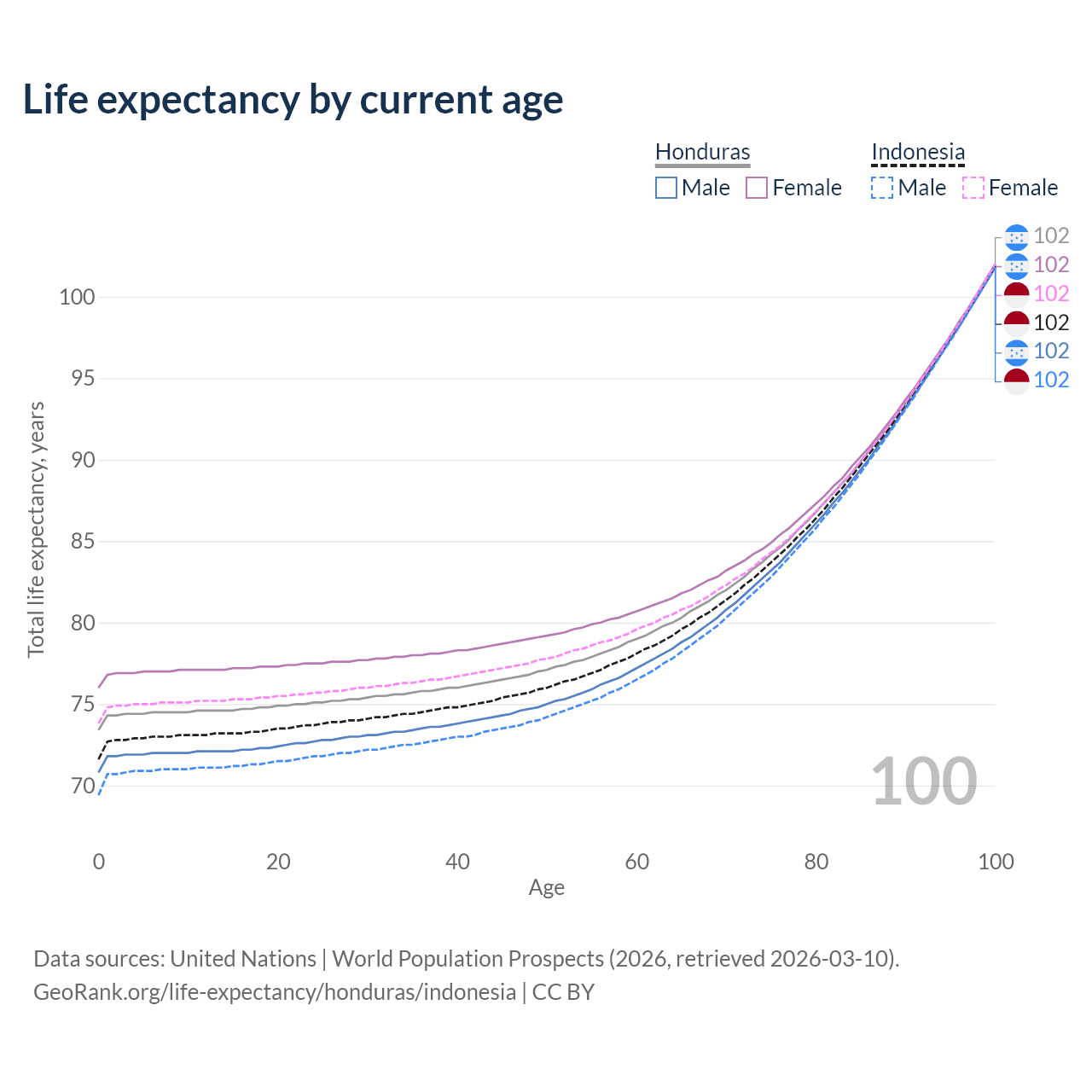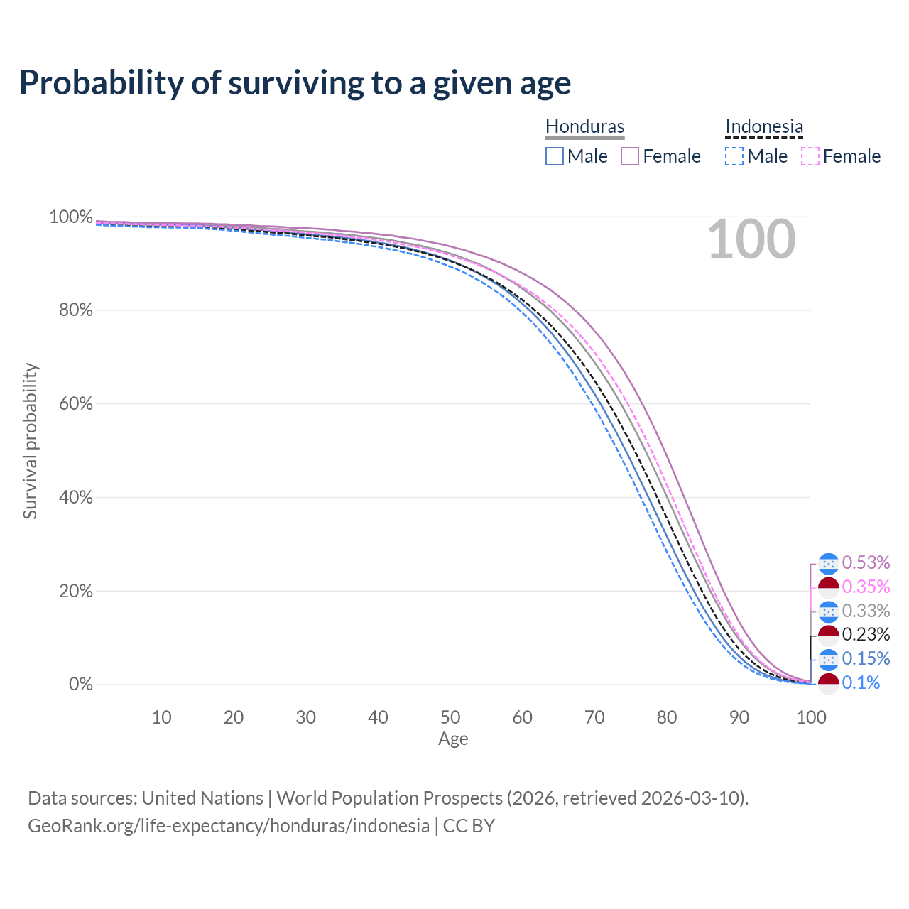 This life expectancy calculator shows the odds of living to 100, 95, 90, and below based on current age for both males and females in Honduras and Indonesia, along with mean and median age of death. The calculations are based on the 2026 life tables (actuarial tables) from the UN World Population Prospects.