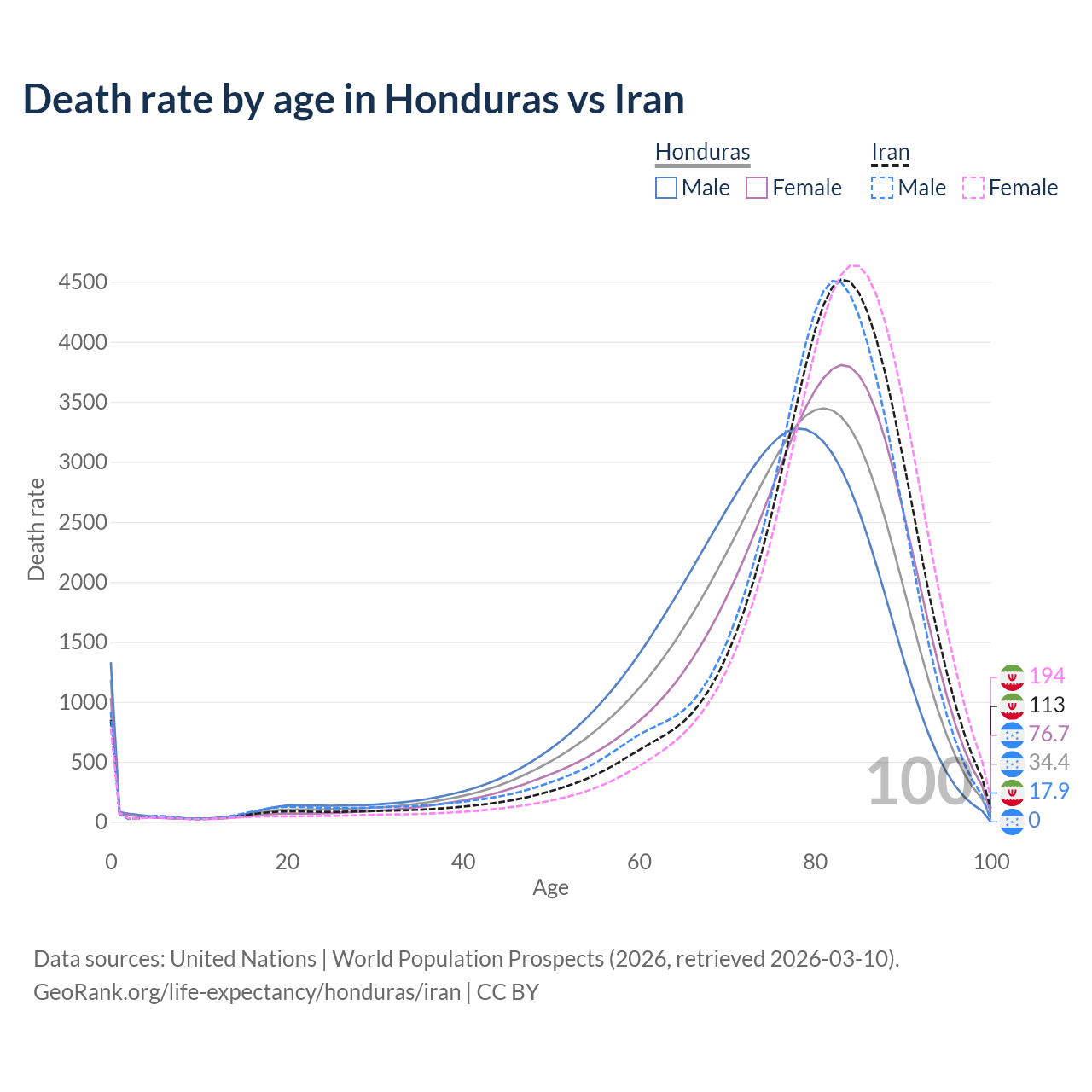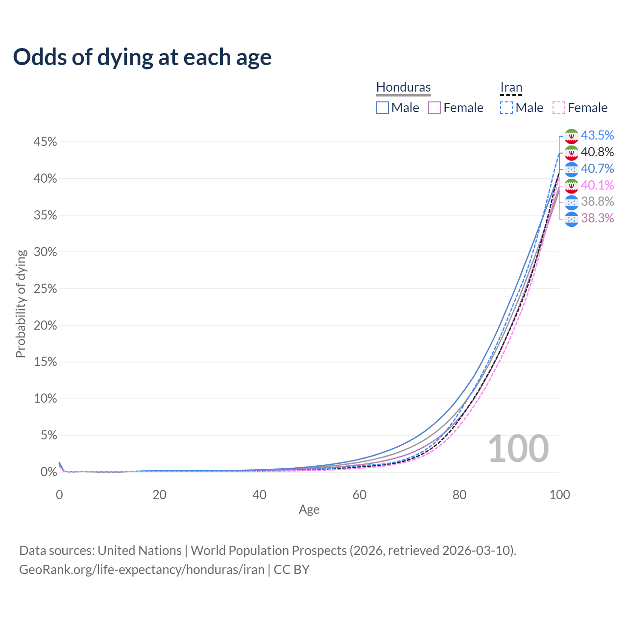 This life expectancy calculator shows the odds of living to 100, 95, 90, and below based on current age for both males and females in Honduras and Iran, along with mean and median age of death. The calculations are based on the 2026 life tables (actuarial tables) from the UN World Population Prospects.