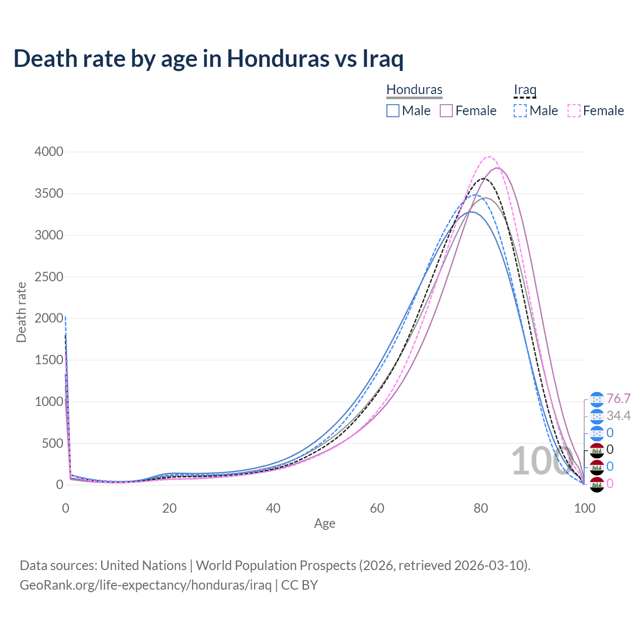 In Honduras, the most common age of death is 81, compared to 81 in Iraq. The median age of death is 77.1 in Honduras and 76.7 in Iraq, meaning only half of each cohort is expected to live past that age.