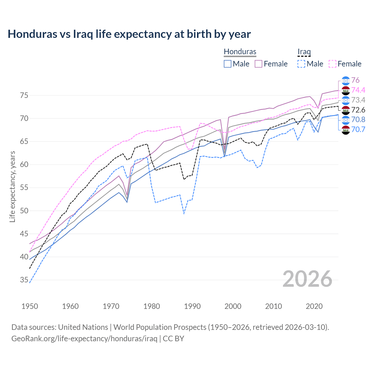 The average life expectancy at birth is 73.4 years in Honduras vs 72.6 in Iraq. Honduras is ranked 110/197 by life expectancy, and Iraq is 118/197. In Honduras, the life expectancy is 70.8 years for males and 76 years for females. In Iraq, it's 70.7 years for males and 74.4 years for females.