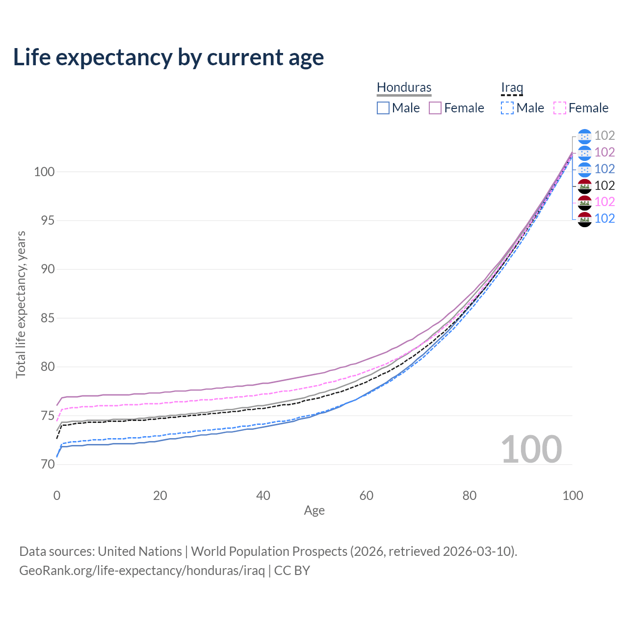 This life expectancy calculator shows the odds of living to 100, 95, 90, and below based on current age for both males and females in Honduras and Iraq, along with mean and median age of death. The calculations are based on the 2026 life tables (actuarial tables) from the UN World Population Prospects.