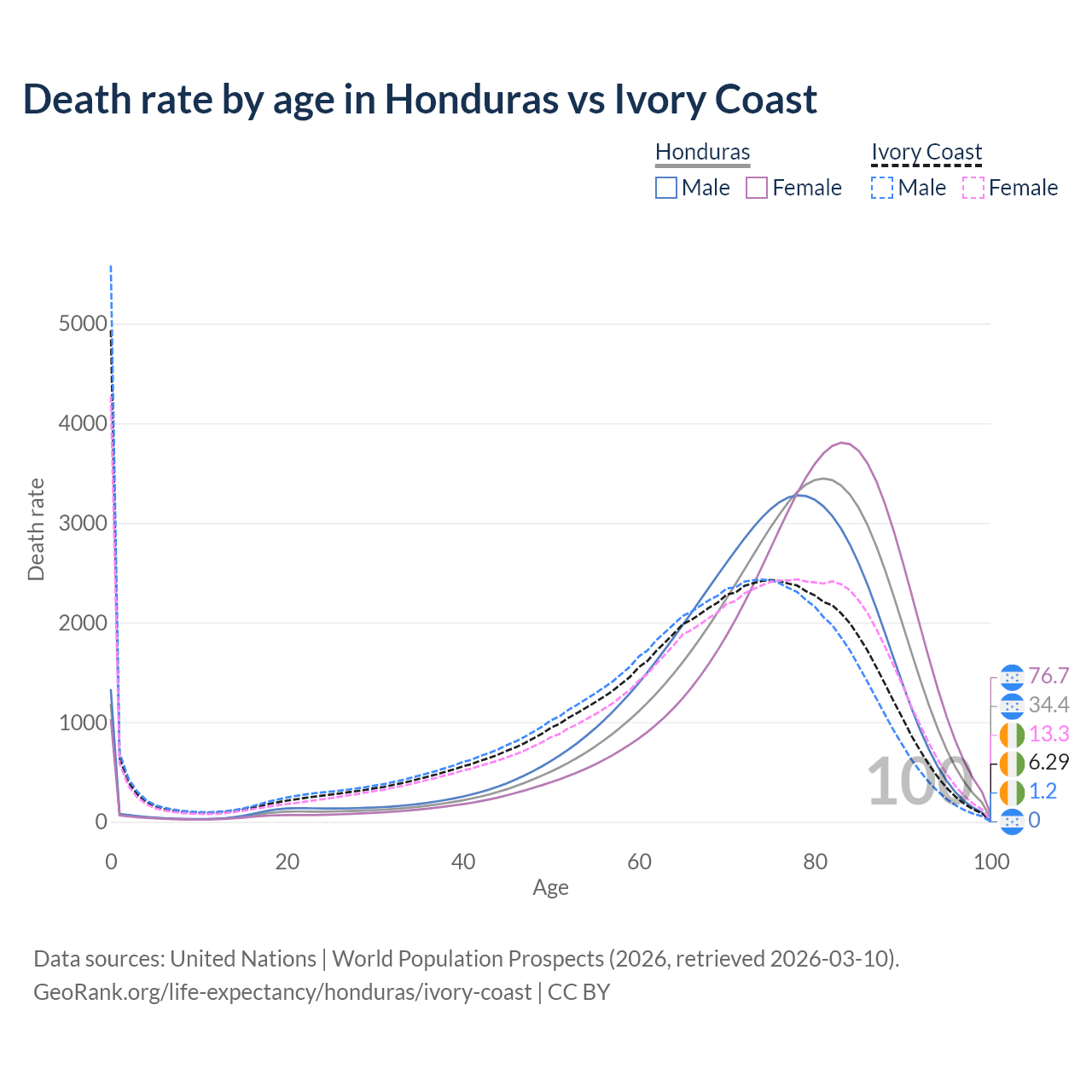 In Honduras, the most common age of death is 81, compared to 0 in Ivory Coast. The median age of death is 77.1 in Honduras and 68.6 in Ivory Coast, meaning only half of each cohort is expected to live past that age.