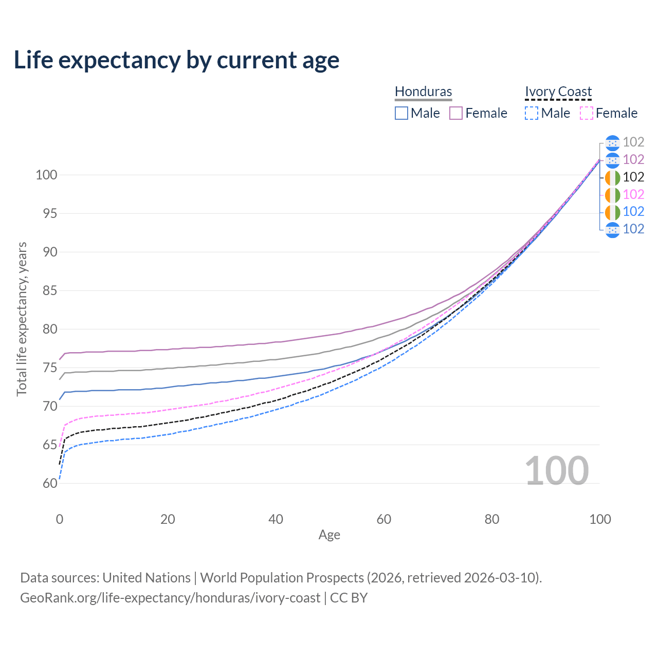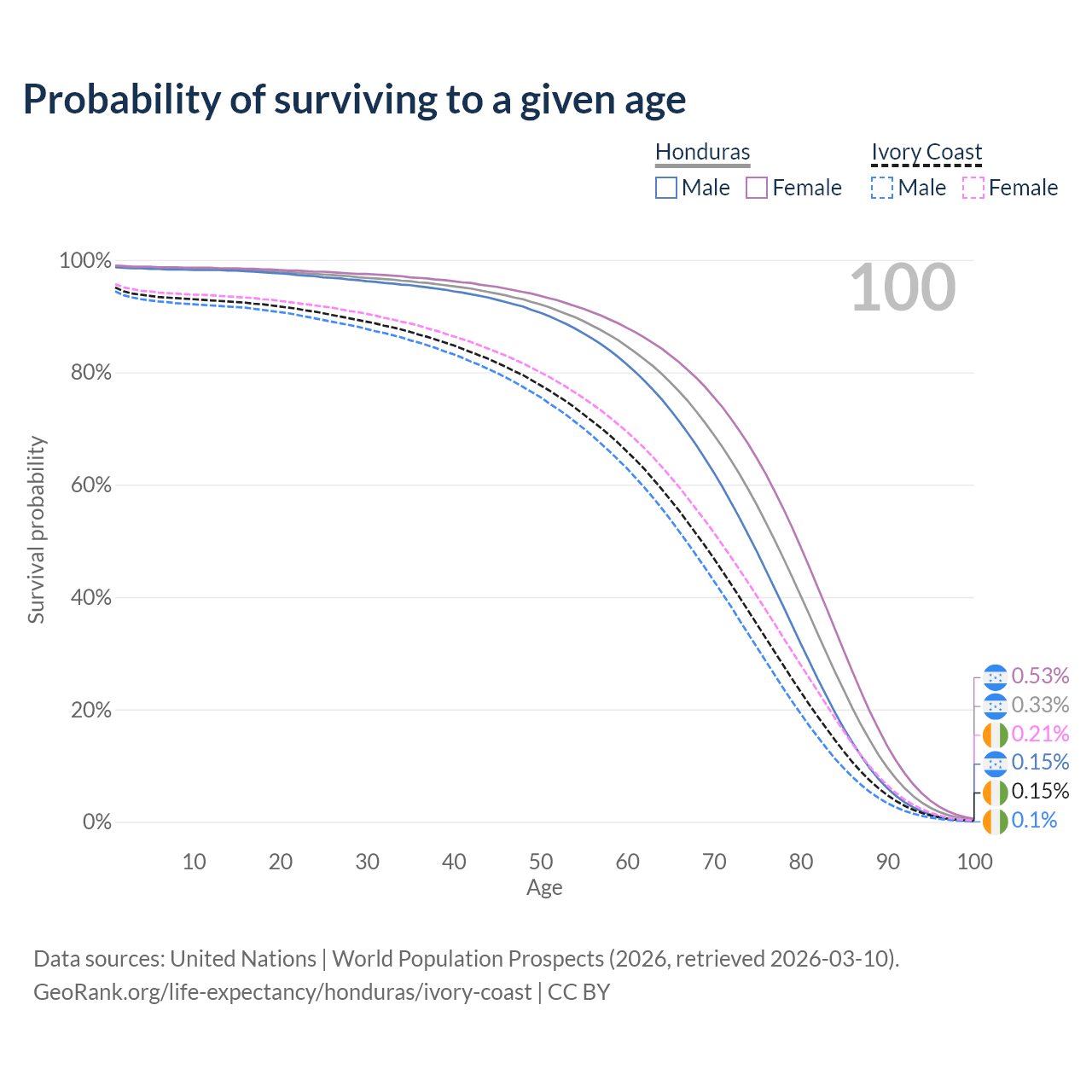 This life expectancy calculator shows the odds of living to 100, 95, 90, and below based on current age for both males and females in Honduras and Ivory Coast, along with mean and median age of death. The calculations are based on the 2026 life tables (actuarial tables) from the UN World Population Prospects.