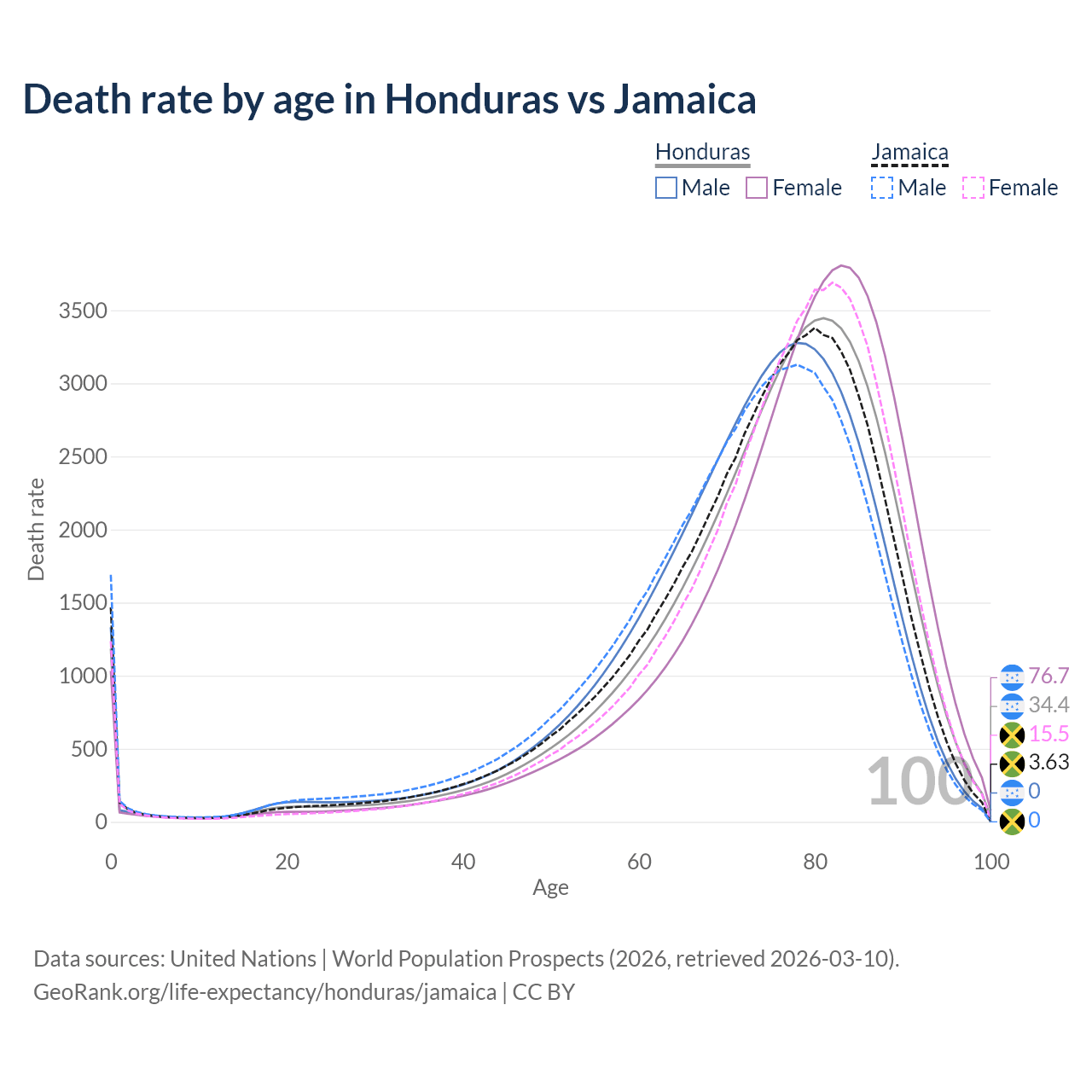 In Honduras, the most common age of death is 81, compared to 80 in Jamaica. The median age of death is 77.1 in Honduras and 75.7 in Jamaica, meaning only half of each cohort is expected to live past that age.