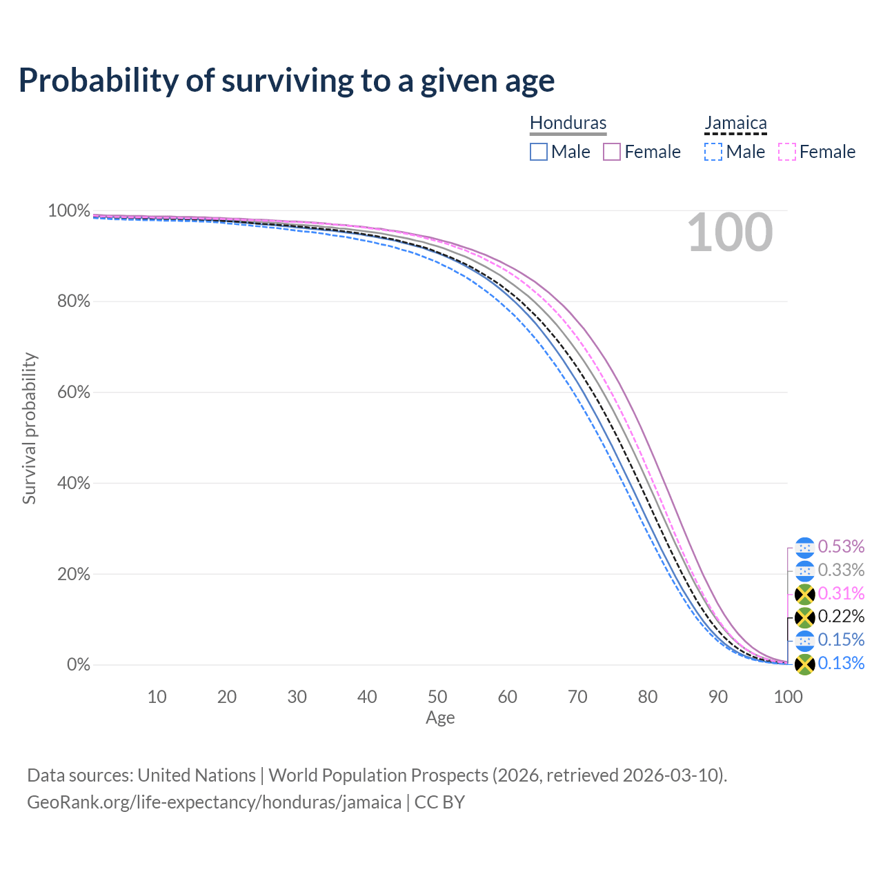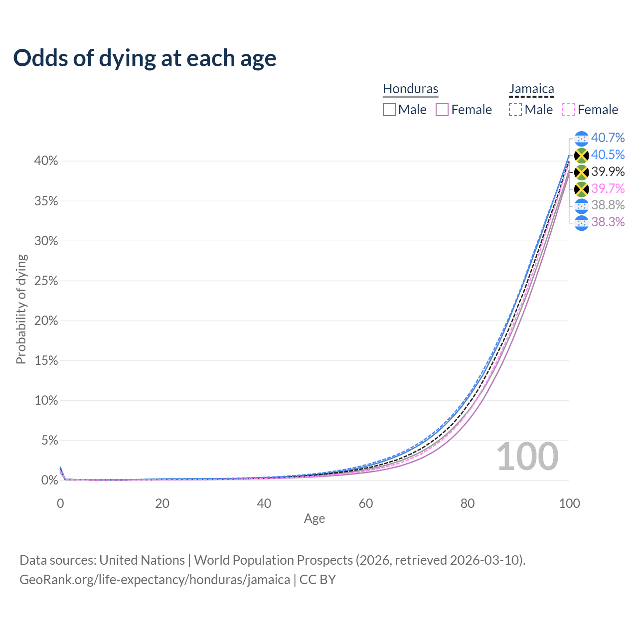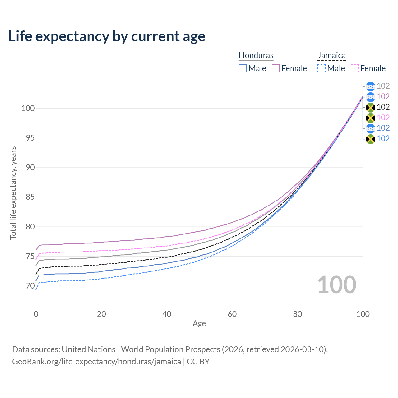 This life expectancy calculator shows the odds of living to 100, 95, 90, and below based on current age for both males and females in Honduras and Jamaica, along with mean and median age of death. The calculations are based on the 2026 life tables (actuarial tables) from the UN World Population Prospects.