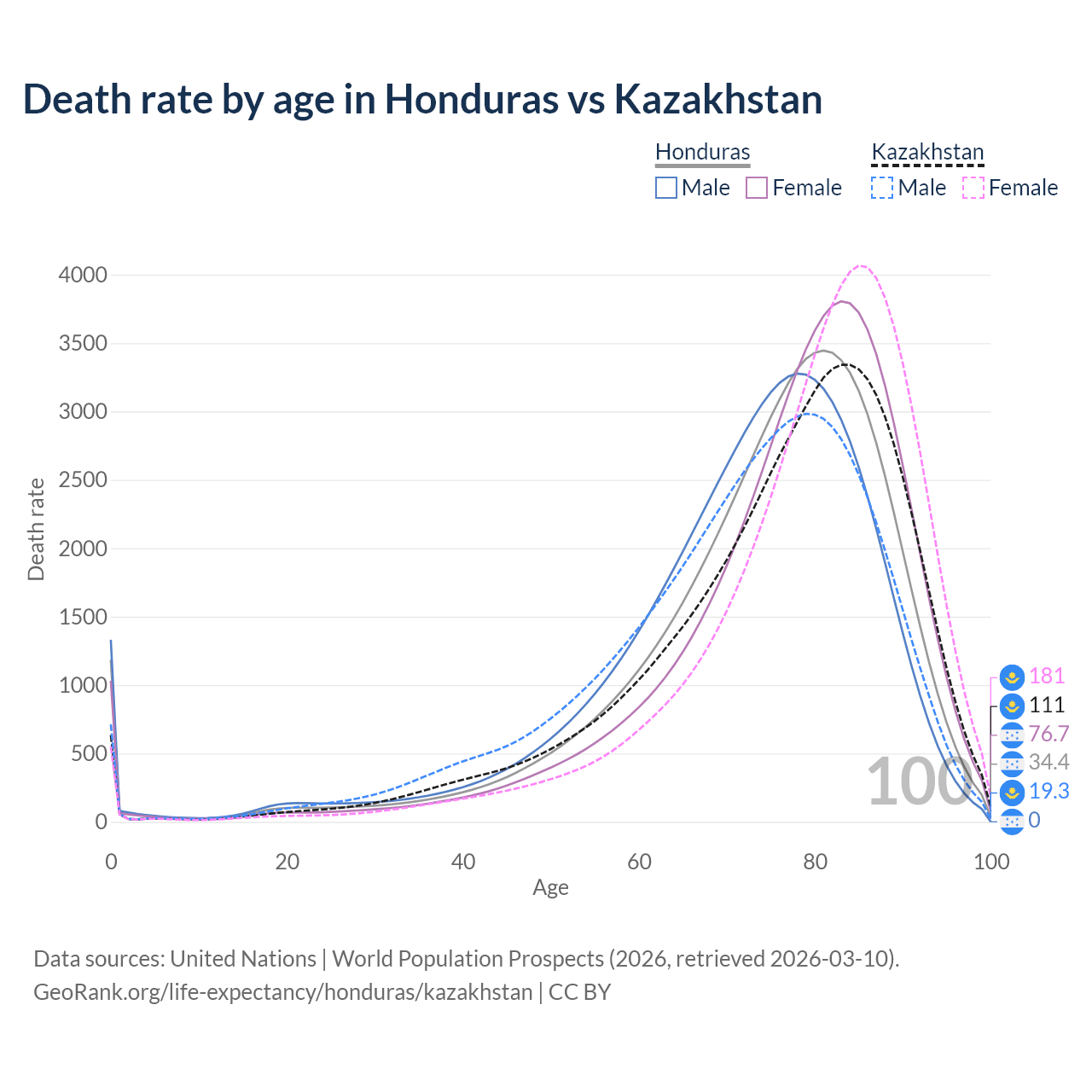 In Honduras, the most common age of death is 81, compared to 84 in Kazakhstan. The median age of death is 77.1 in Honduras and 78.6 in Kazakhstan, meaning only half of each cohort is expected to live past that age.