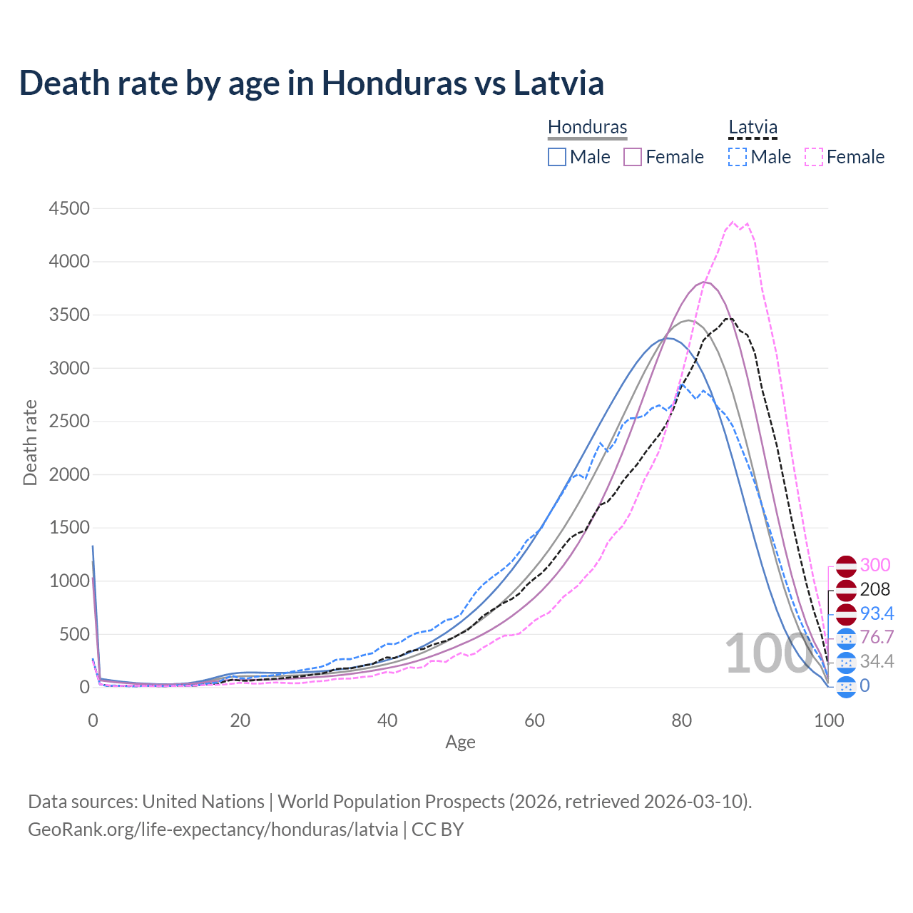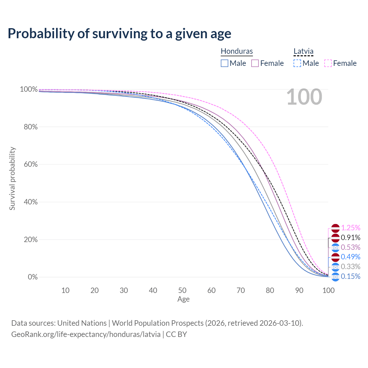 This life expectancy calculator shows the odds of living to 100, 95, 90, and below based on current age for both males and females in Honduras and Latvia, along with mean and median age of death. The calculations are based on the 2026 life tables (actuarial tables) from the UN World Population Prospects.