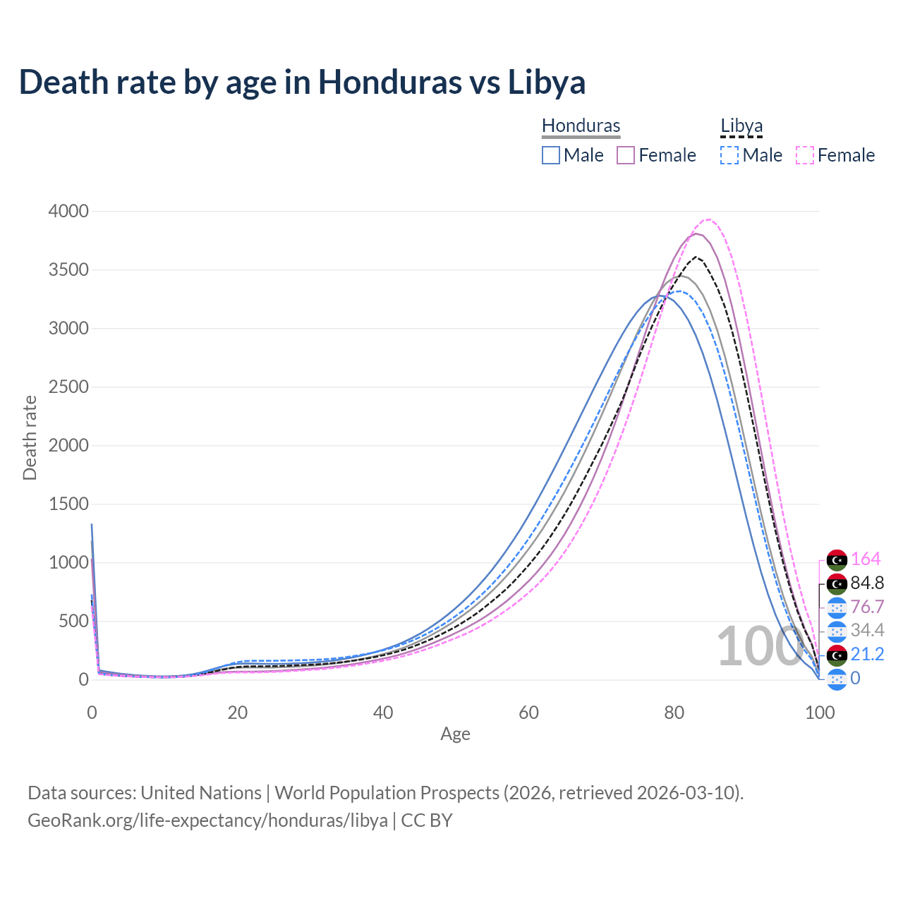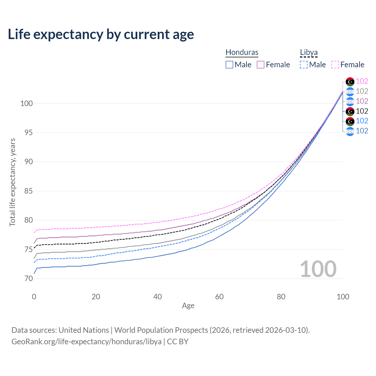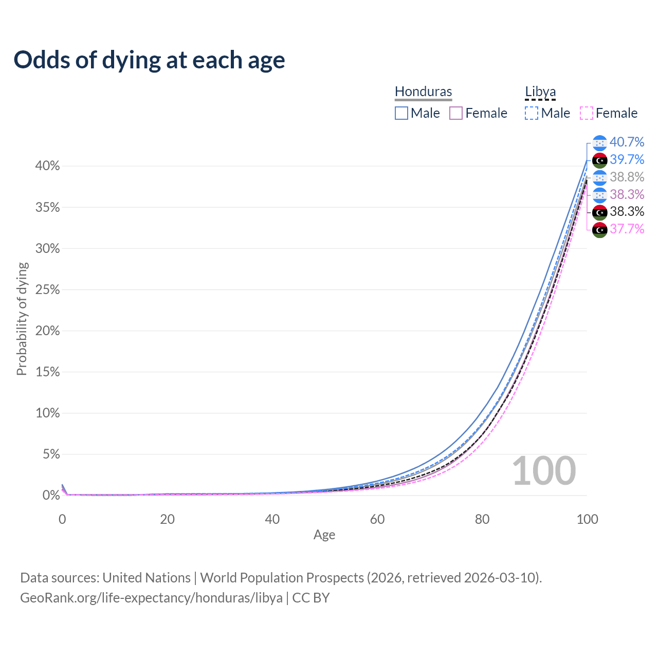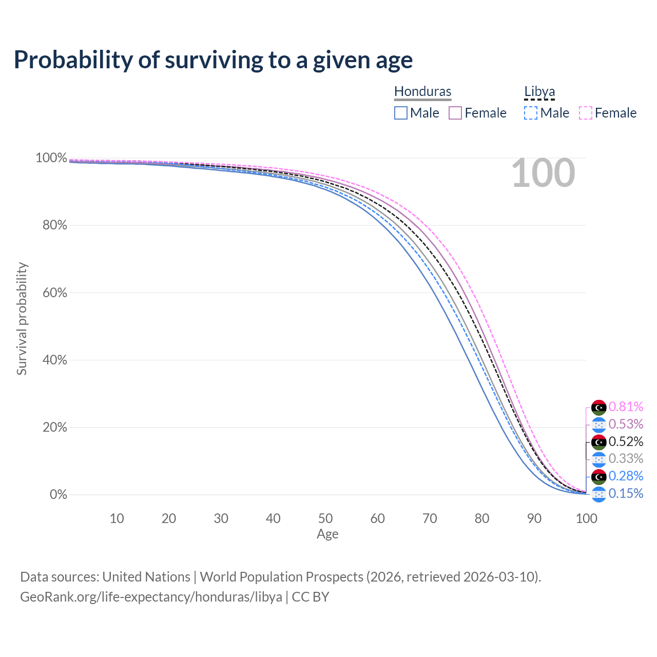 This life expectancy calculator shows the odds of living to 100, 95, 90, and below based on current age for both males and females in Honduras and Libya, along with mean and median age of death. The calculations are based on the 2026 life tables (actuarial tables) from the UN World Population Prospects.