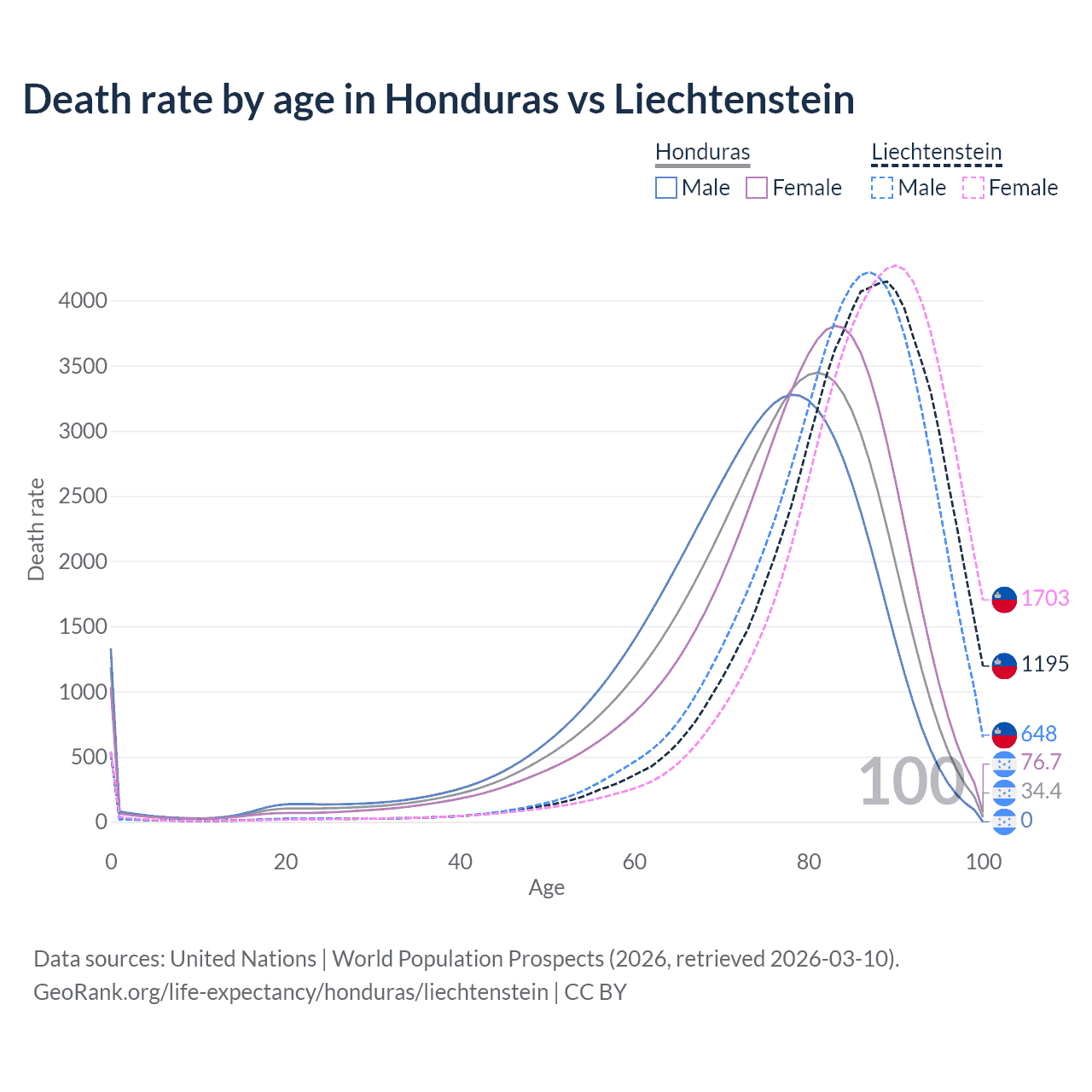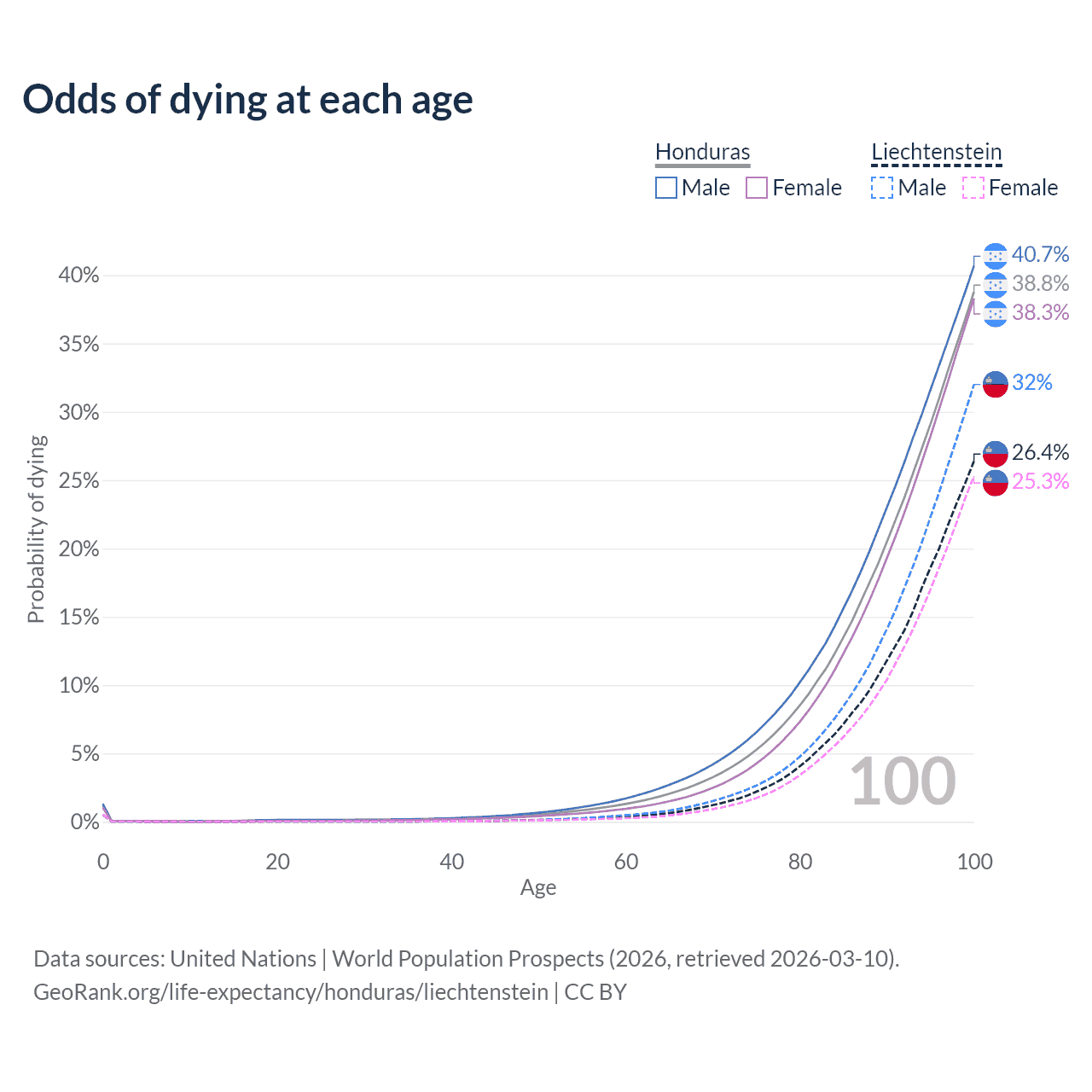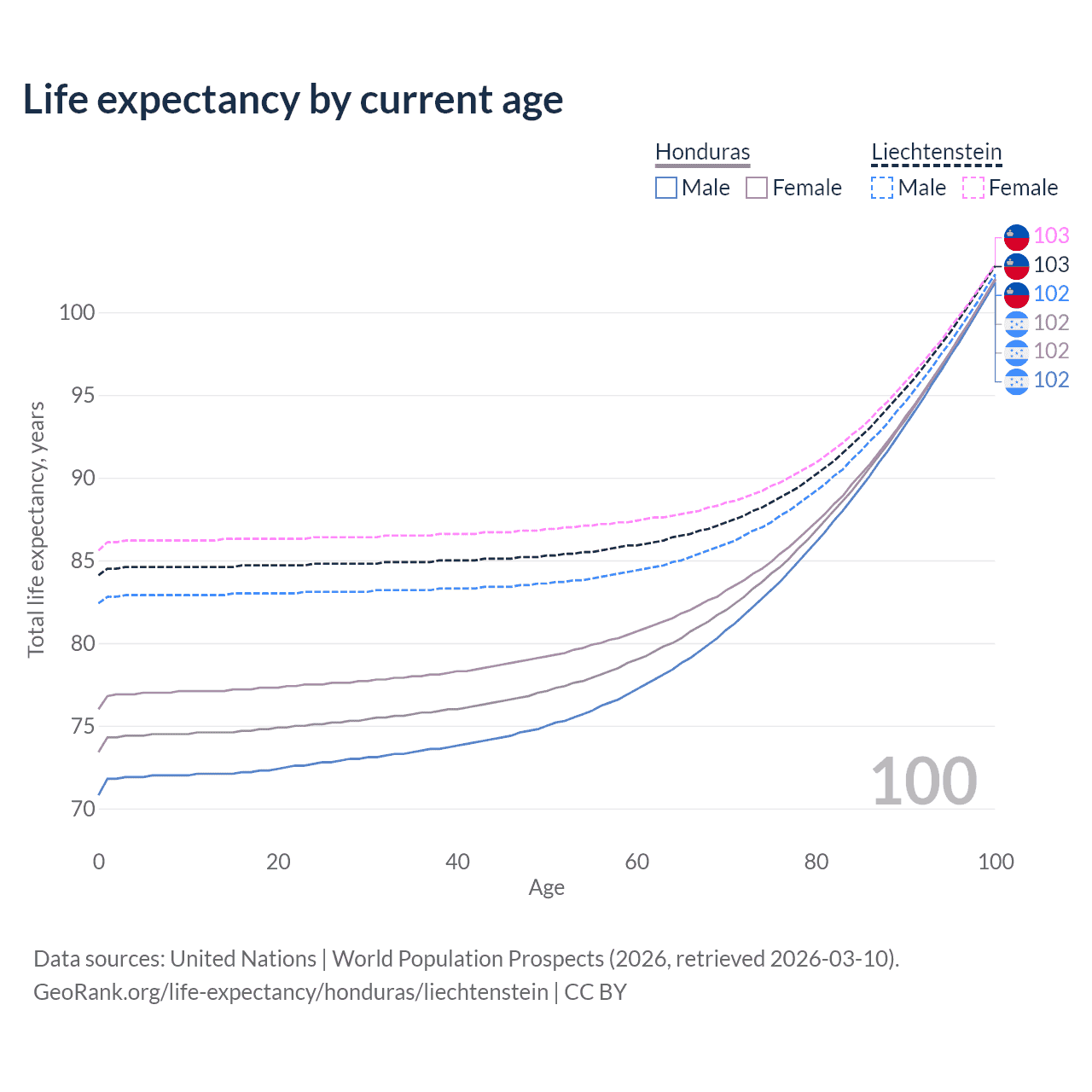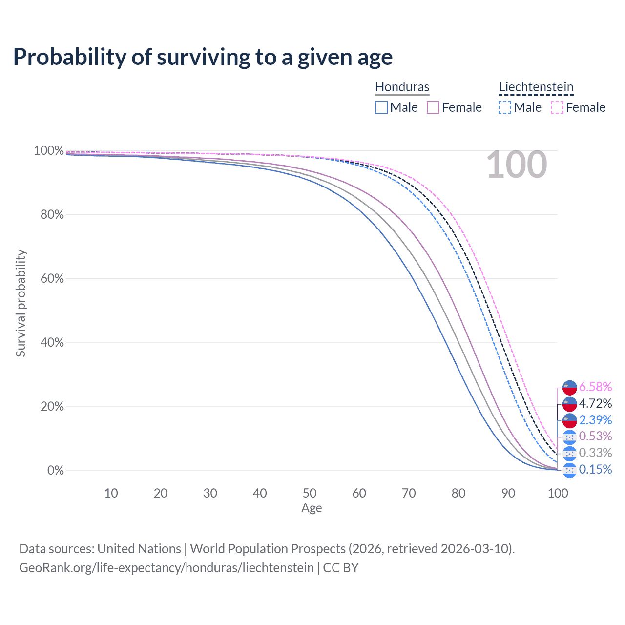 This life expectancy calculator shows the odds of living to 100, 95, 90, and below based on current age for both males and females in Honduras and Liechtenstein, along with mean and median age of death. The calculations are based on the 2026 life tables (actuarial tables) from the UN World Population Prospects.